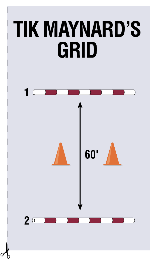 Challenge yourself to get 5 even, 10-foot strides between the two poles. The extra 10 feet is for take-off and landing. - Alternate between 5 and 6 strides, 4 times in a row: