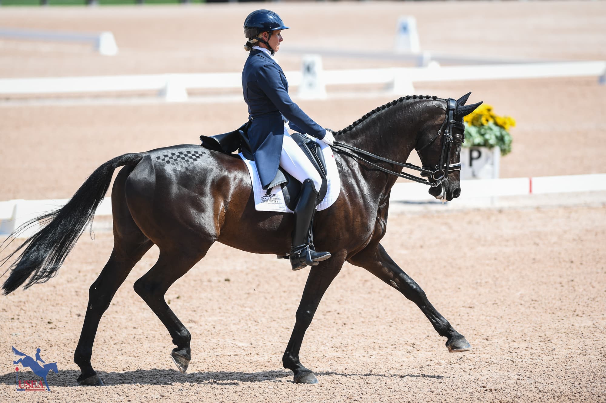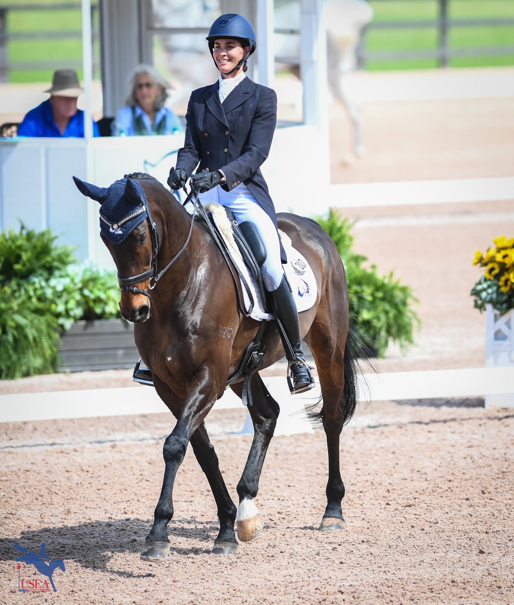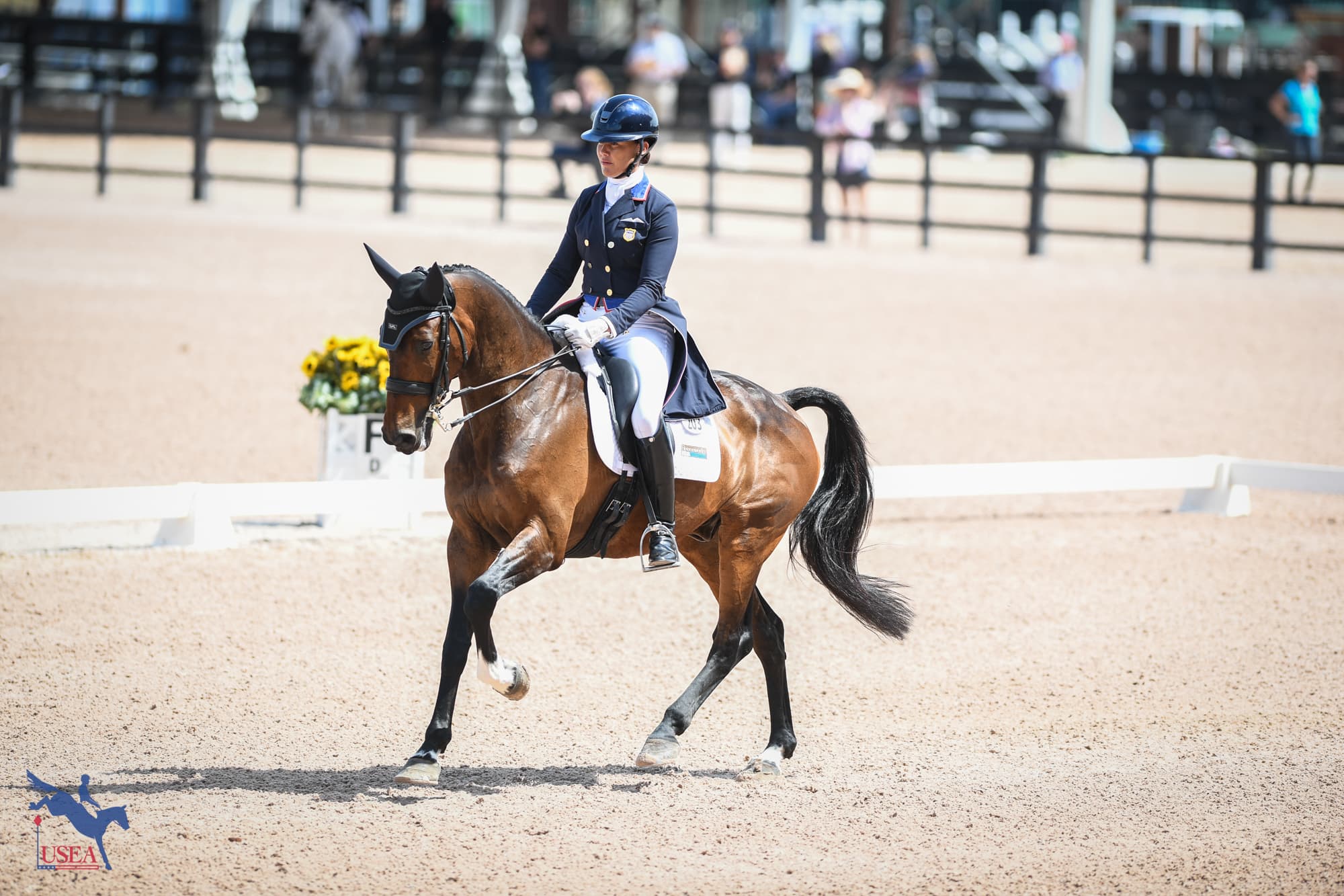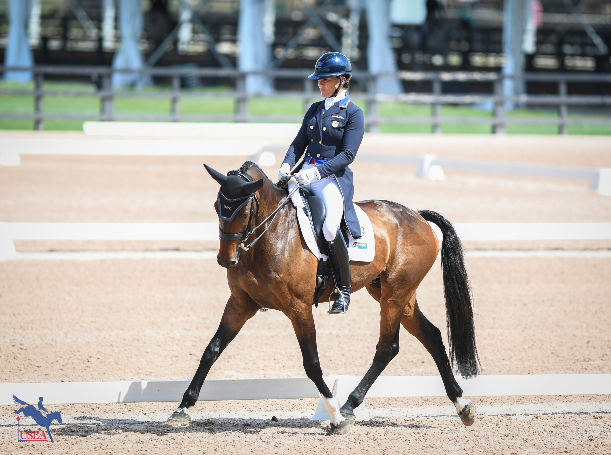 “The heat definitely felt like it zapped him, and I felt like I had too much warm-up,” she said of her test, which scored a 32.8. “That was kind of a bummer because it felt like I was really on to something at Kentucky, and he just didn’t have quite the same pizazz that he normally has, but he was still very obedient. In six months when he keeps gaining the strength that he’s gaining, it’s going to be really great. I had to really work to keep him together, but he was super obedient, and that’s what I’m after. The tension has always a little bit taken over and helped him with the strength piece. Now I’m seeing him be less tense and seeing a little bit more of his weaknesses, but I’m still very pleased with him. I think the judging is quite hard, but they’re judging everybody equally, so I’m happy.”