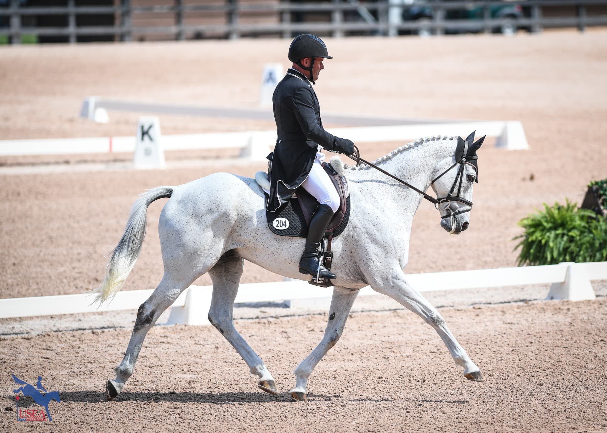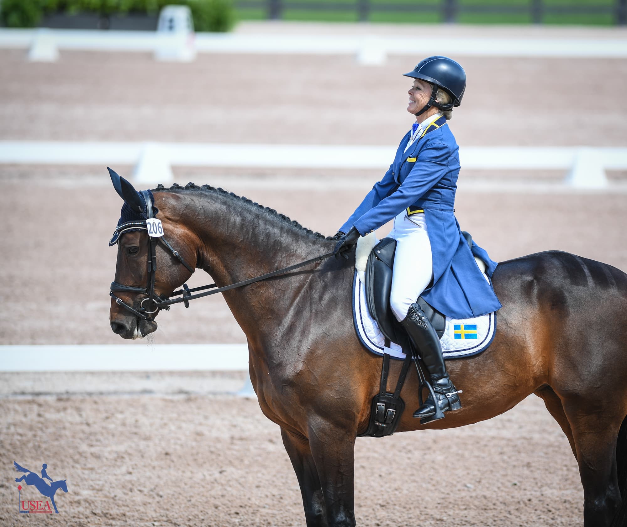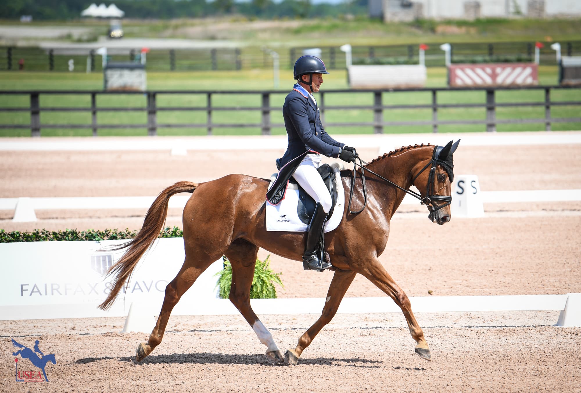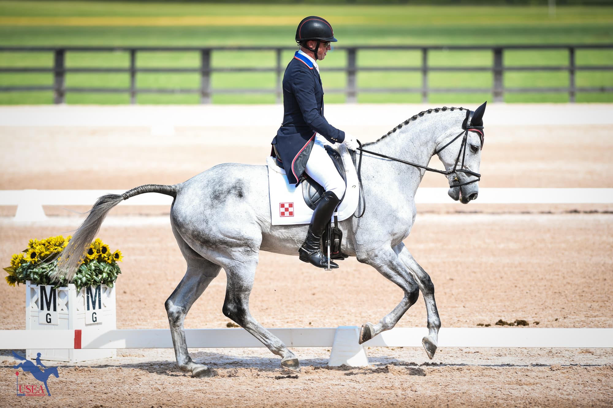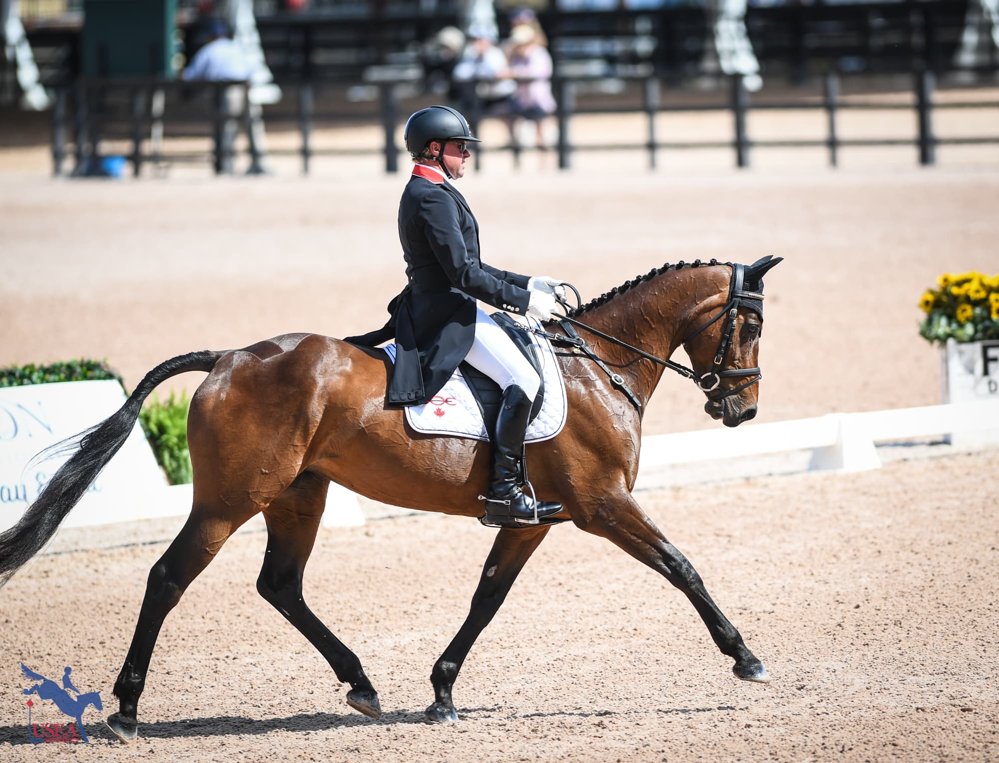 “The heat definitely felt like it zapped him, and I felt like I had too much warm-up,” she said of her test, which scored a 32.8. “That was kind of a bummer because it felt like I was really on to something at Kentucky, and he just didn’t have quite the same pizazz that he normally has, but he was still very obedient. In six months when he keeps gaining the strength that he’s gaining, it’s going to be really great. I had to really work to keep him together, but he was super obedient, and that’s what I’m after. The tension has always a little bit taken over and helped him with the strength piece. Now I’m seeing him be less tense and seeing a little bit more of his weaknesses, but I’m still very pleased with him. I think the judging is quite hard, but they’re judging everybody equally, so I’m happy.”