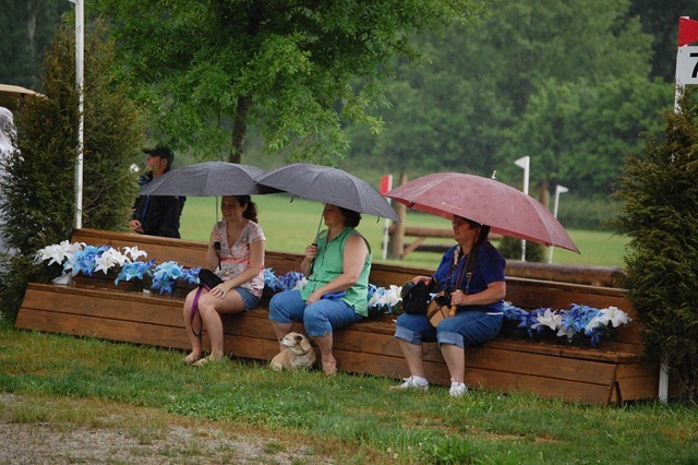 The first half of my division went before the monsoon hit. When the thunder and lightning started, a quick and smart decision was made to put all phases on a hold. After about 30 minutes we returned and started out on course. Nobody made time after the break. I am proud that we were all smart enough to slow down and ride safely, even those in the hunt for a ribbon. My mare was wonderful and came home safe, sound, and drenched almost a full minute over optimum. The volunteers were out in droves tending to take-offs and landings both on XC and in stadium. They stood out in the pouring rain for hours, and I never saw a single one without a smile on their face. The organizers did everything possible to keep the day running safely while still allowing all phases to continue. Their effort is very much appreciated.