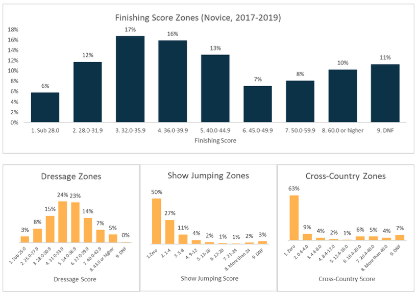 Eventing is about putting all three phases together to finish strong, but what is a strong finish at the Novice level? What types of tests and rounds are the top finishers producing? The graphs and tables below show you what it takes to win.