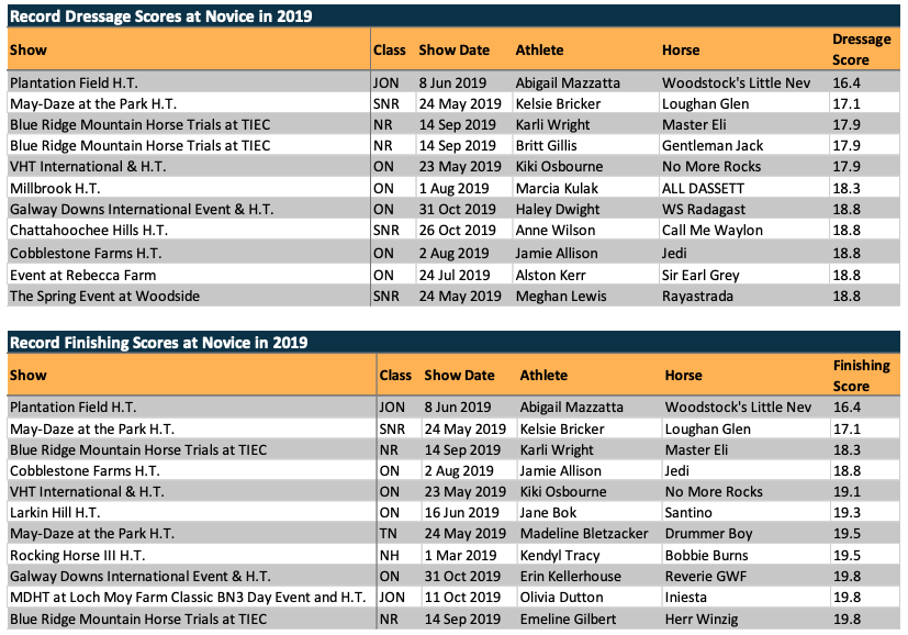 Lastly, we have pulled the 2019 record dressage scores and record finishing scores from the Novice level. These are some very impressive numbers!