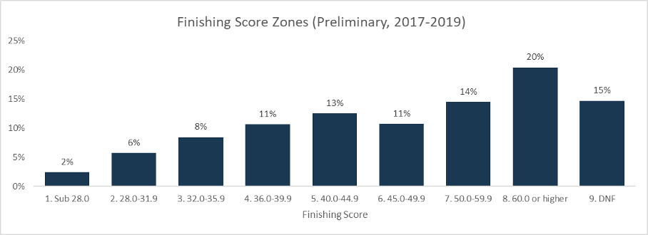 - Sub-36 Zones: Similar to the DNF zone, about 3 in 20 Preliminary starters (16%), finish sub 36.0.