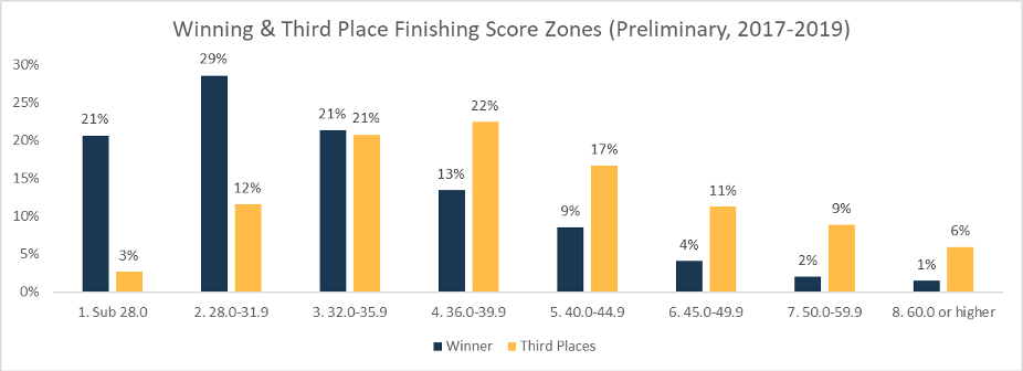 - A Preliminary score in the 32 to 45 range still gives you a strong chance at a third-place finish. 3 out of 5 (60%) third-place finishers come from this range.