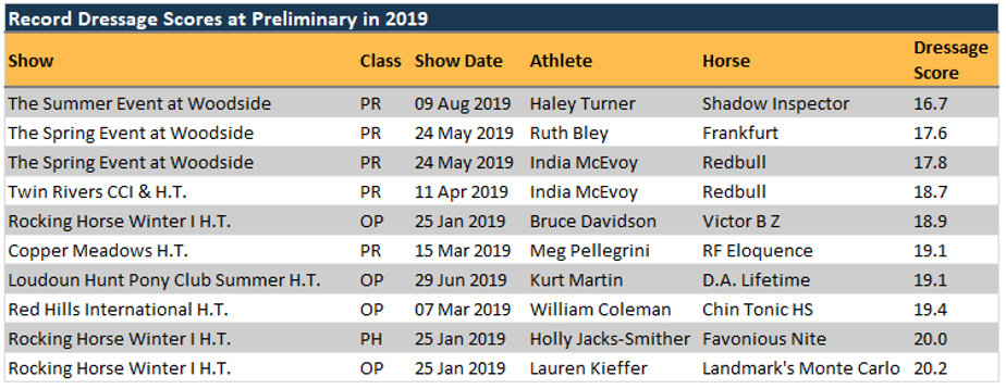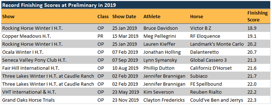 Lastly, we have pulled the 2019 Preliminary record dressage scores and record finishing scores. There are some recognizable names on these lists but also some combinations who may not always make the eventing headlines. Take a look – these numbers might be your reach goals!