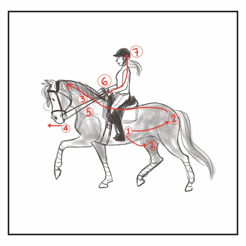 The circle/cycle of energy originates with the (1) rider's legs (input to horse), which induce the horse to move his (2) hind legs (output). When the horse's hind legs propel the (3) entire body forward, (4) the bit moves forward in space along with the horse. When the horse moves forward enough in response to the leg stimulus, he will pick up the slack in the (5) reins (as long as they aren’t too long) as a result of the bit's forward movement. The (positive) tension on the reins further increases as the horse extends his neck due to the lifting of the spine caused by the hind legs stepping for- ward under his body. The rider can then feel this connection in the reins with (6) her hands (output of horse is input to rider) and determine (7) from this input whether to send the horse forward with (1 again) the leg or to ease off on the driving aid.