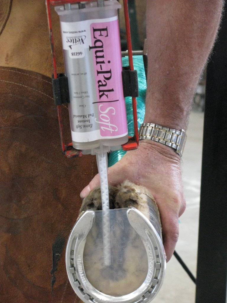 If a barefoot horse develops corns, horse owners can use pour-in pad materials to help with the healing process and allow bruised feet to heal. Some fast-setting, soft pad materials bond directly to the sole and frog, and improve the depth of the sole. These soft packing materials soften the concussion between the coffin bone and the ground, so the horse has a soft layer of protection to help the hoof heal comfortably. They act as a cushion for the tender feet against abrasive ground surfaces. Depending on the type, some soft pour-in pad materials should be applied under a plastic or leather pad.
