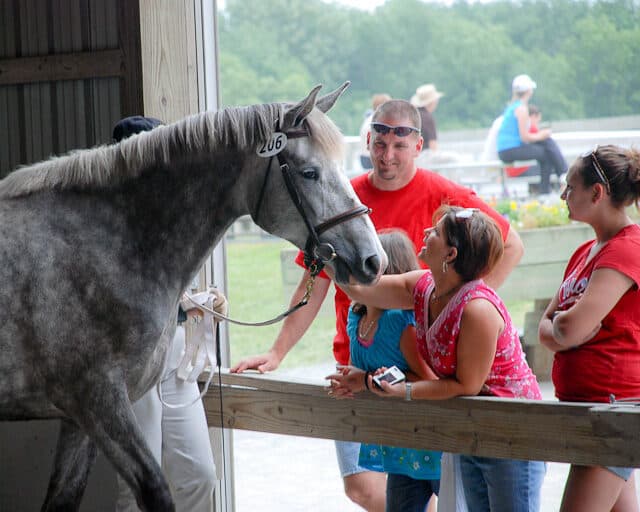 In addition to the Beginner Novice through Intermediate horse trials and Young Event Horse classes held at the Waredaca Horse Trials last weekend in Unity, Maryland, spectators and competitors alike also enjoyed the IDHSNA/USEA Future Event Horse divisions. Pictured: Larry and Michelle Robbins' Two-year-old filly Kilronan's Countess greets her admirers. Emily Daily/USEA photo. FEH and YEH Results | Horse Trials Results