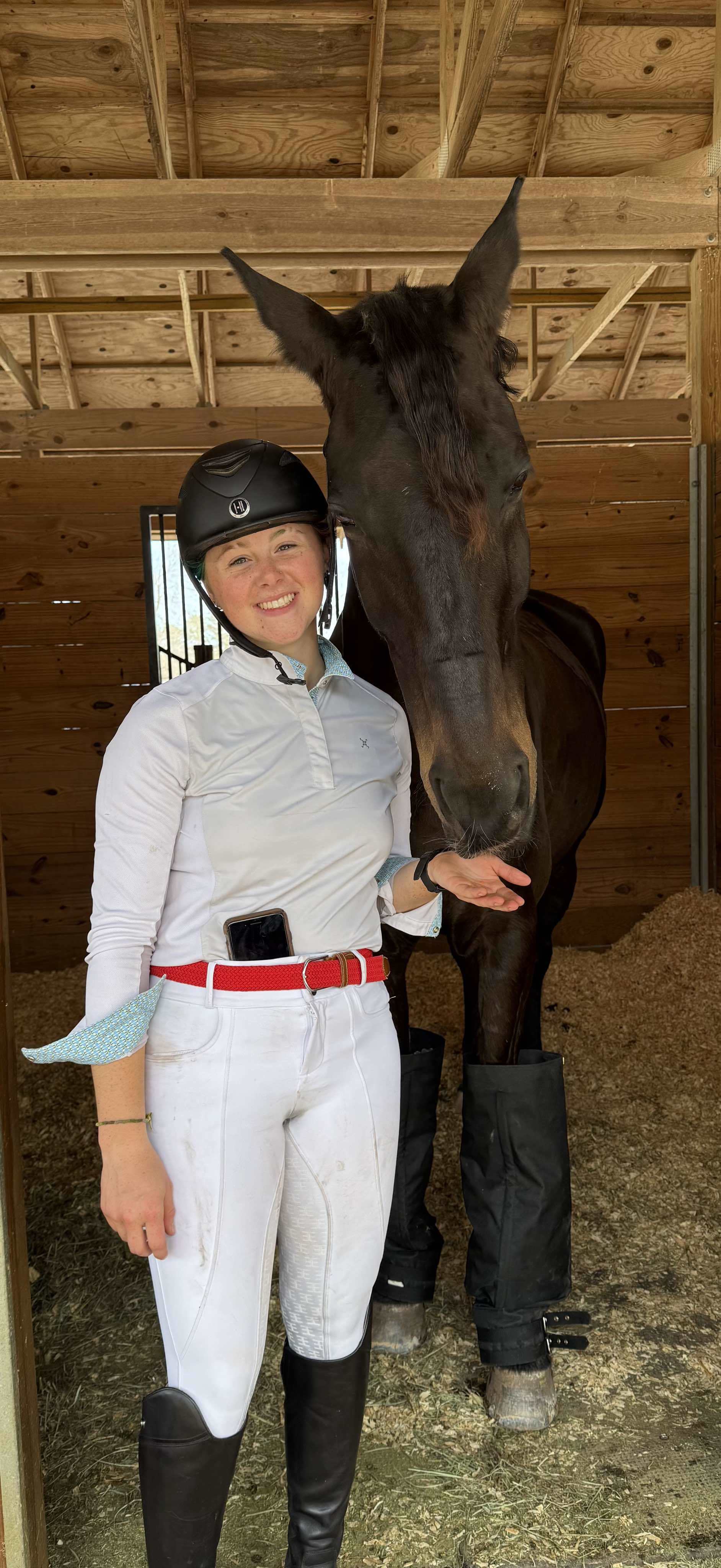 The family bought their first horse during Carolyn’s freshman year, an Irish Sport Horse named The Fernhill Fox. “‘Fox’ was the one who really showed me the ropes—he was a great teacher for me,” Carolyn said. Throughout the year of their partnership, they earned top placings at the Modified level—including ninth place in the 2023 AEC in the Modified Rider division.