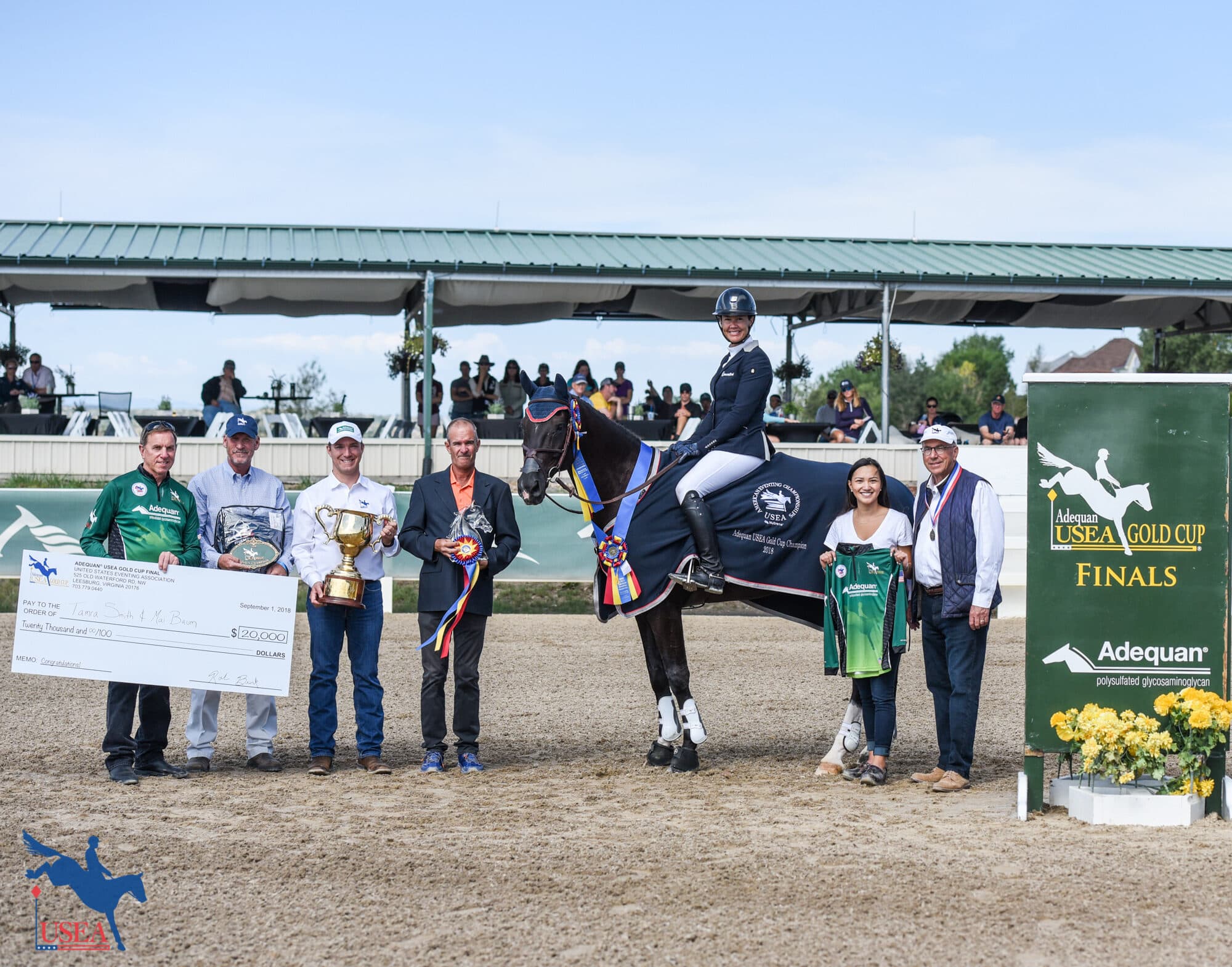 Tamra Smith with Adequan USEA Gold Cup Final first placed Mai Baum, third placed Fleeceworks Royal, and the Next Level Eventing team. USEA/Leslie Mintz Photo.