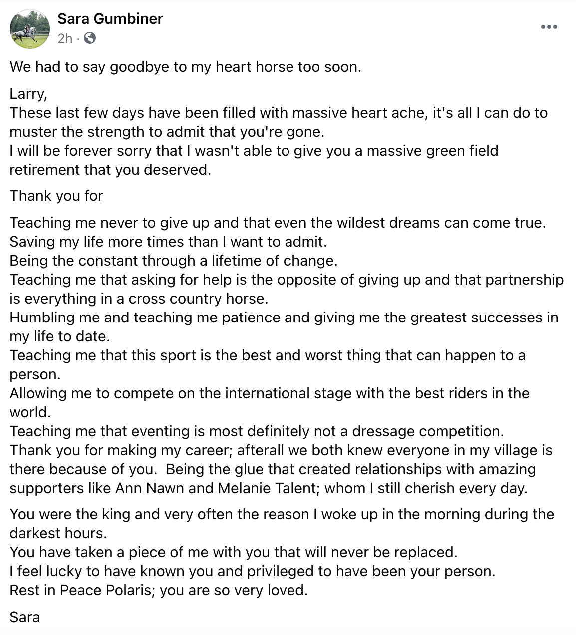 Sara Gumbiner shared the news today that her long-time partner Polaris passed away at the age of 16. Her social media tribute to the Irish Sport Horse gelding reflected on their career together and all of the wonderful ways that he impacted her life and career. The post read: