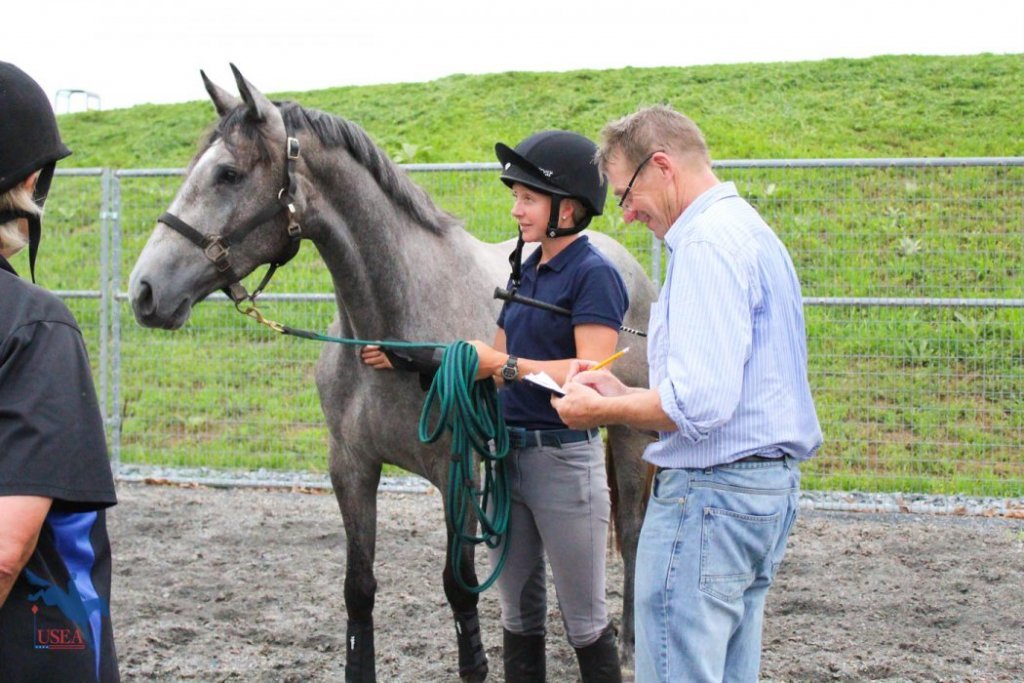 Chris Ryan taking notes on a horse participating in the FEH Jump Chute Clinic at Loch Moy Farm. USEA/Jessica Duffy Photo.