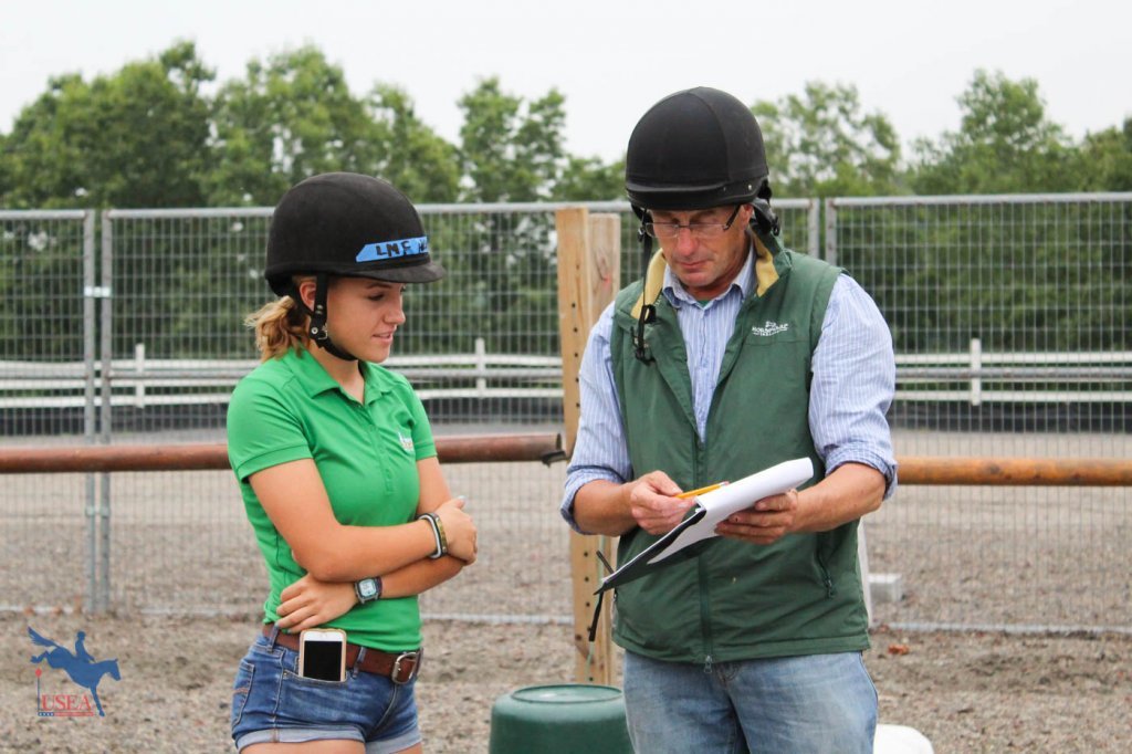 Chris Ryan reviewing the FEH scoring sheet with a participant in the FEH Jump Chute Clinic at Loch Moy Farm. USEA/Jessica Duffy Photo.