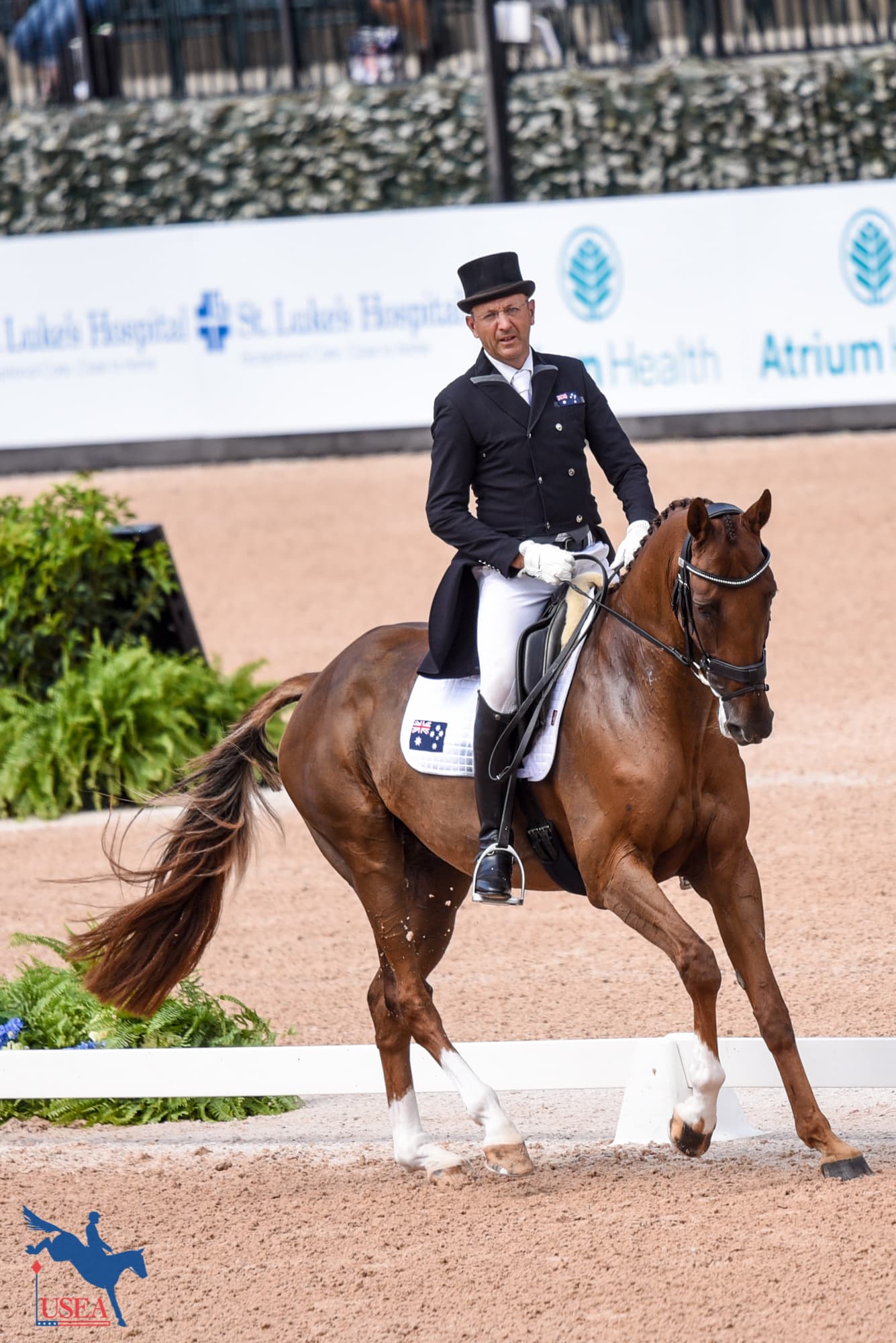 Clouds continued to roll in over the Tryon International Equestrian Center (TIEC) in Mill Spring, North Carolina as Hurricane Florence made landfall along the coast of the Carolinas earlier this morning. Nevertheless, the second day of dressage competition at the FEI World Equestrian Games Tryon 2018 (WEG) eventing world championships continued today with the final 41 competitors performing their tests in front of ground jury members Anne-Mette Binder (DEN), Andrew Bennie (NZL), and Jane Hamlin (USA).