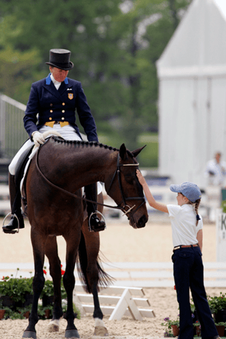 Karen O’Connor and Joan Goswell’s Irish Thoroughbred Gelding, Mandiba, put in their best test ever to move into the lead at the 2010 Rolex Kentucky CCI4*. After her test, O’Connor recognized the hard work of the volunteers by allowing the young gatekeeper to give Mandiba a congratulatory pat. The pair scored a 43.7 which pushed morning leaders, Becky Holder and Courageous Comet, into second. Phillip Dutton and The Foreman round out the top three with a 47.2.