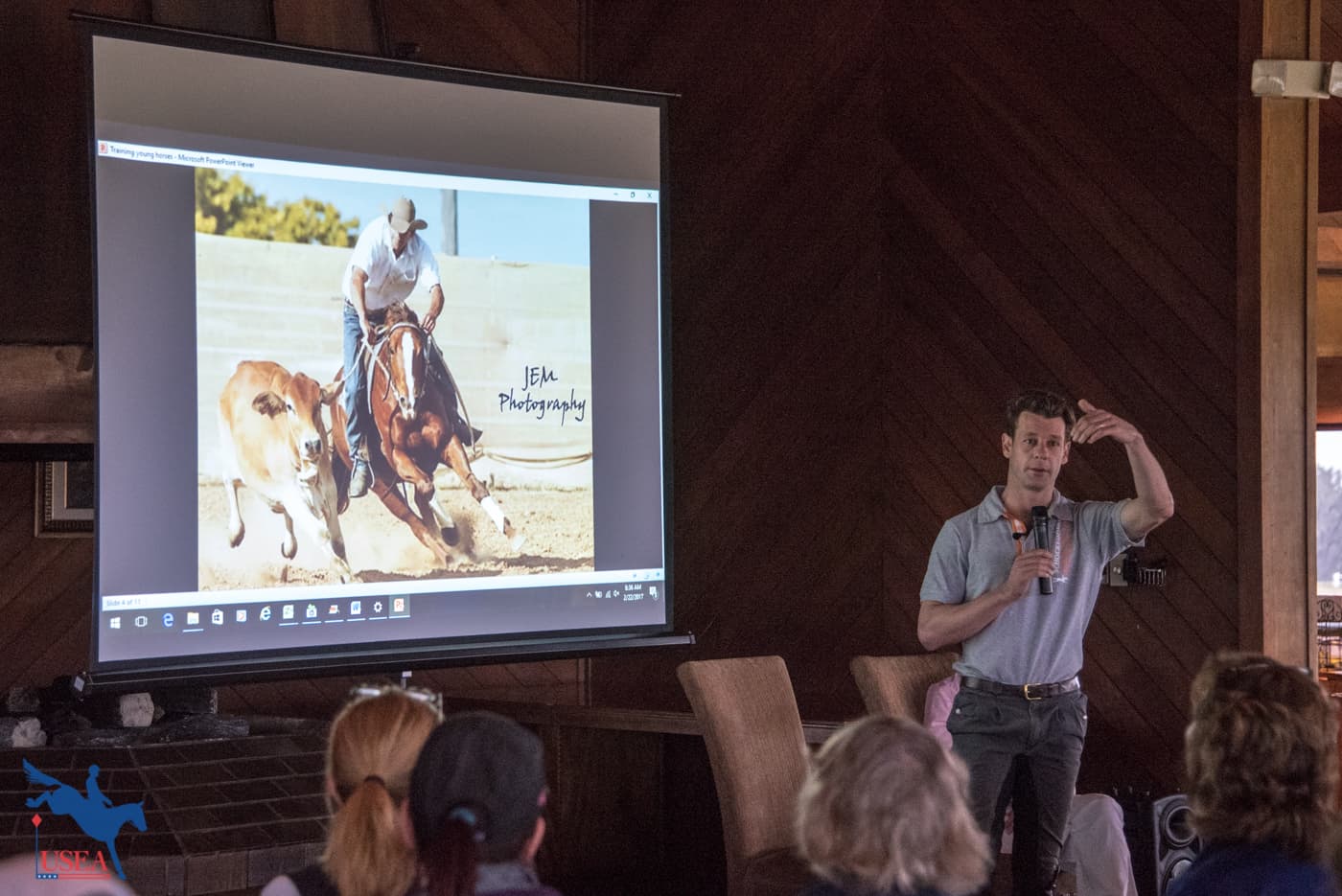 Chris Burton shows a picture of his brother riding a cutting horse. USEA/Leslie Mintz Photo.