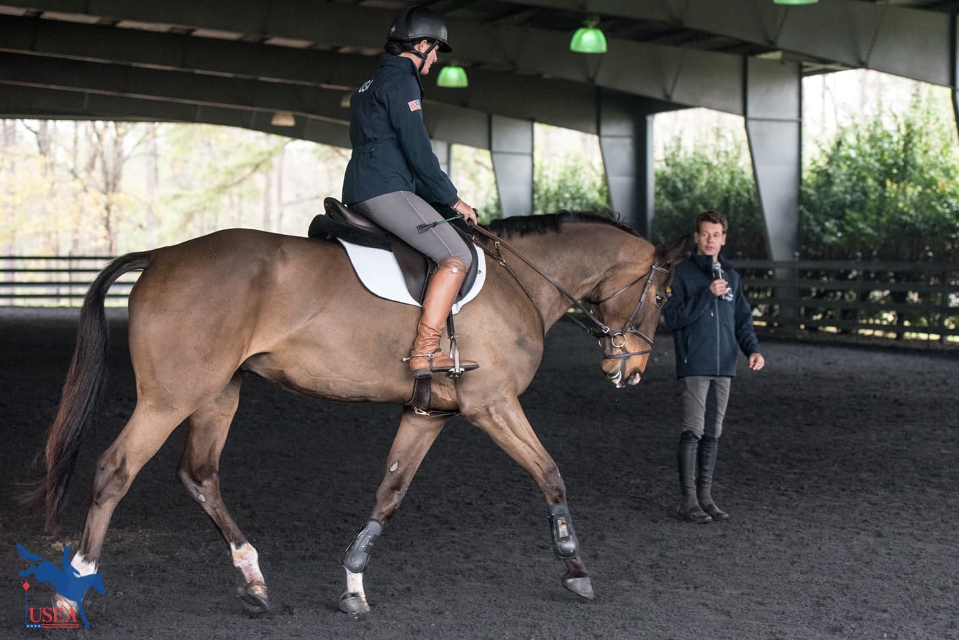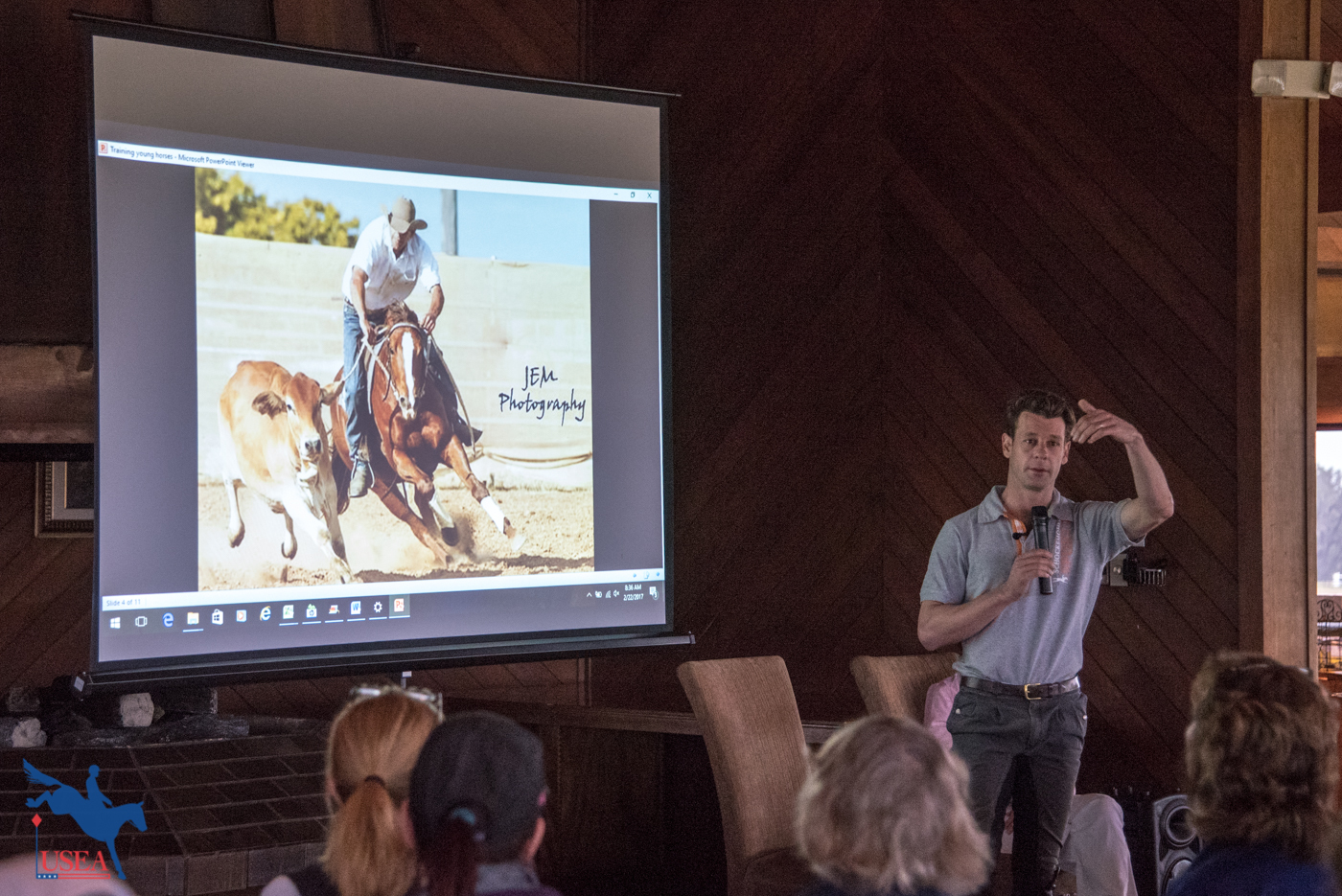 The USEA turned the microphone over to Chris Burton once again for the third day of the Young Horse and Instructors’ Certification Program Symposium. The final – and soggiest – day focused on the Young Event Horse (4- and 5-year-olds) and Burton’s theories for starting them, training them and bringing them up the levels.