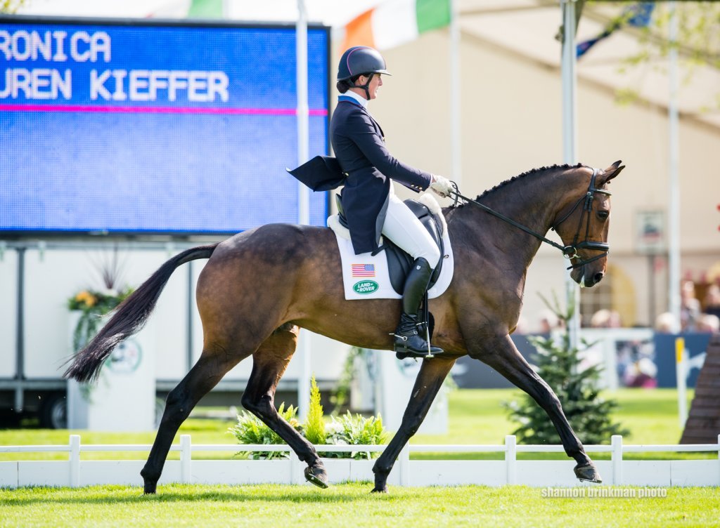 Lauren Kieffer and Team Rebecca LLC's Veronica, are competing in their second Badminton and scored a 25.0 for fourth place. After her test, Kieffer said, "I'm tickled with her, she was just lovely in there. I think a lot of horses are just relieved to get off the footing in the warm-up and be on the fresh ground. They feel great when they get in there. I'm thrilled with her; she's such a professional."