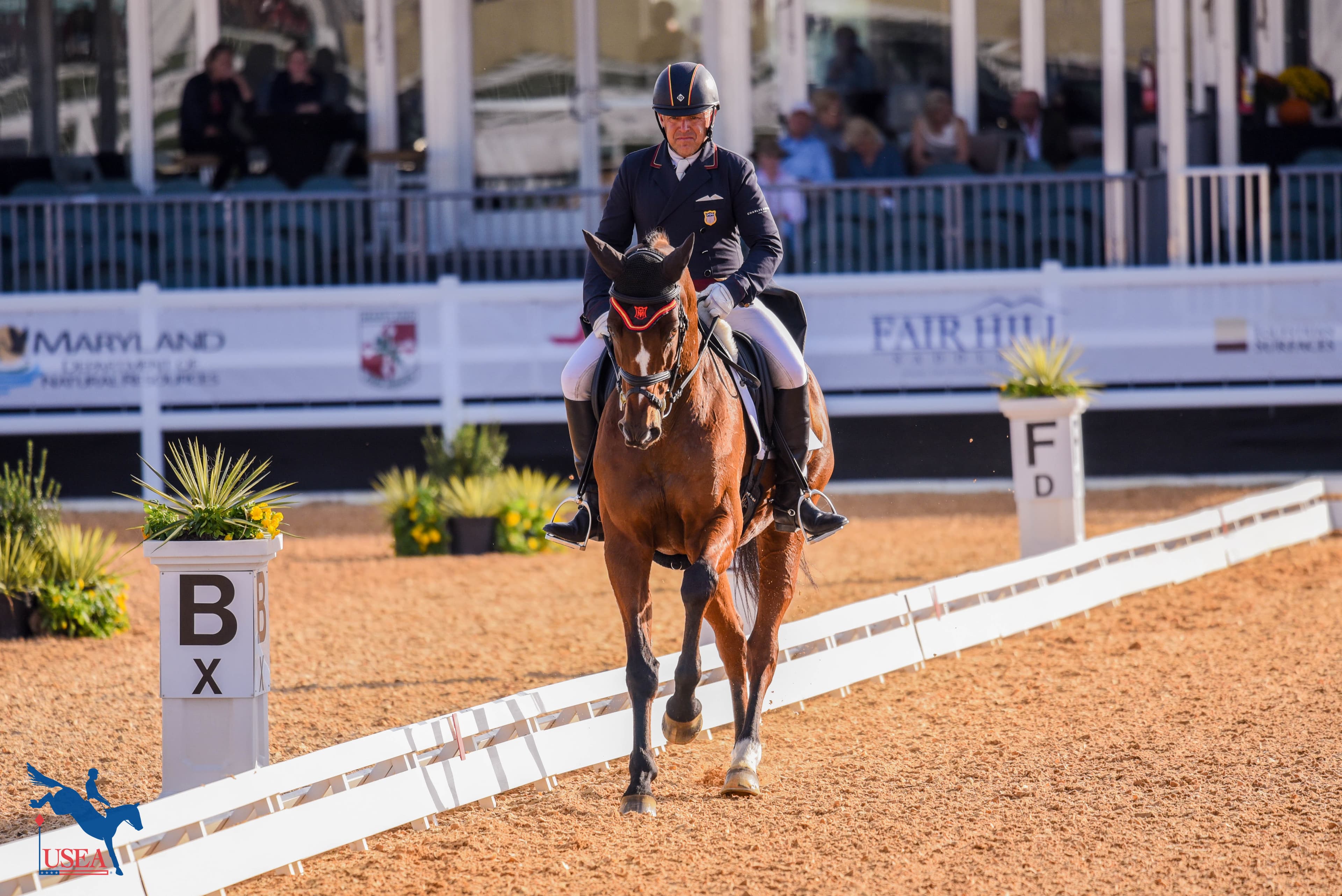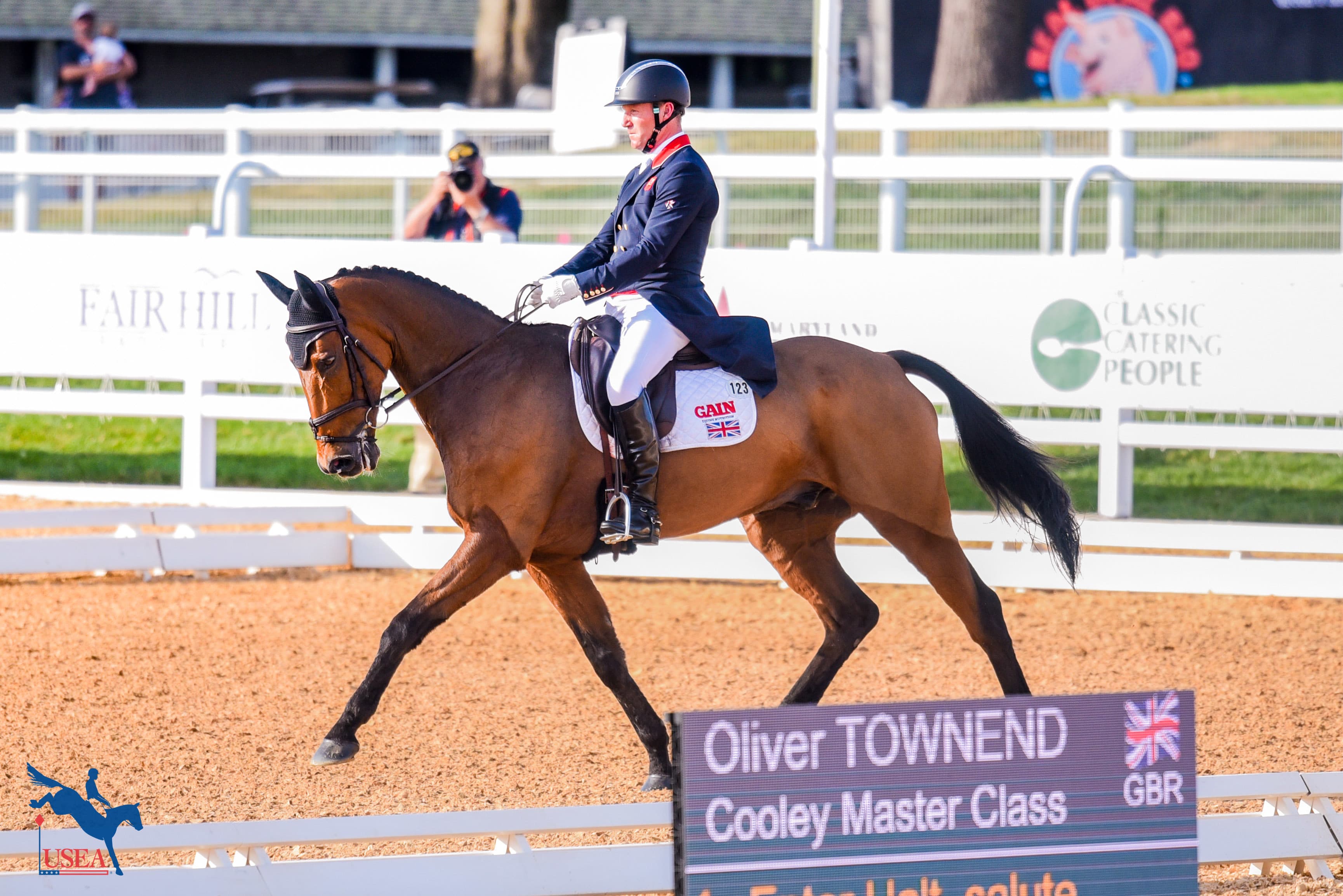 The U.S. is happy hunting ground for Cooley Master Class, Angela Hislop’s 16-year-old Irish Sport Horse gelding (Ramiro B x The Swallow), and so FEI World #1 Oliver Townend keeps crossing the pond to compete in the U.S. five-stars. After back-to-back Kentucky Three-Day Event wins, Cooley Master Class couldn’t defend his title due to a cut keeping him from passing the final jog. He came back to the U.S. to add a new trophy to his collection and is off to a great start scoring a 21.1 and leading the field by a mile following the first day of dressage of the Maryland 5 Star at Fair Hill.