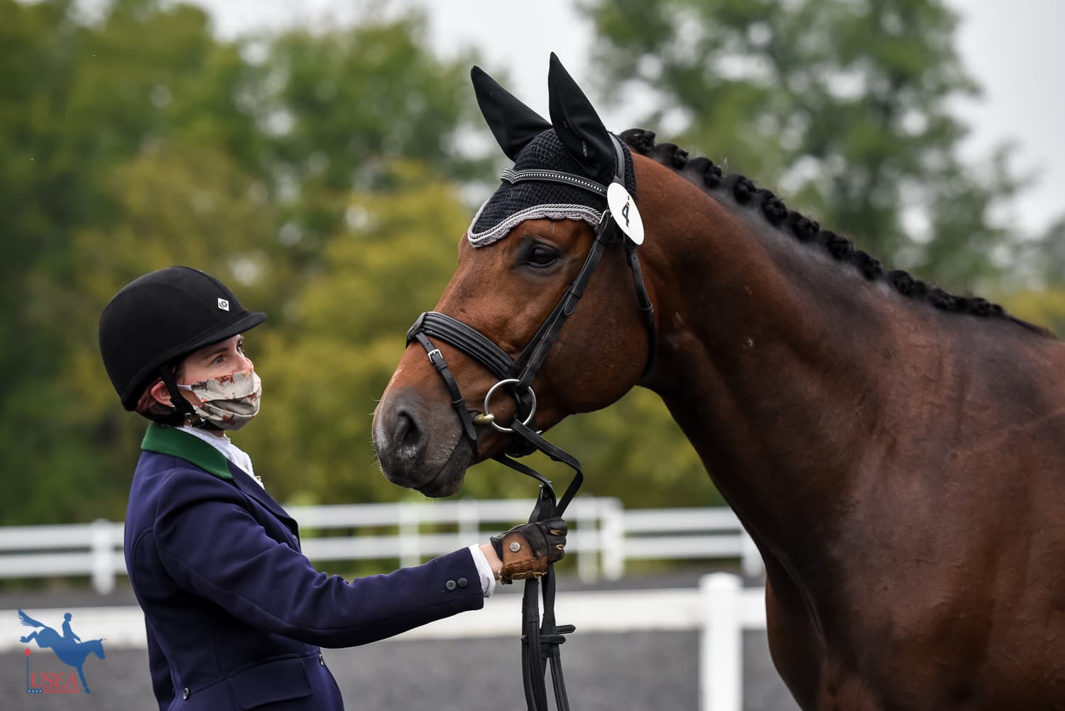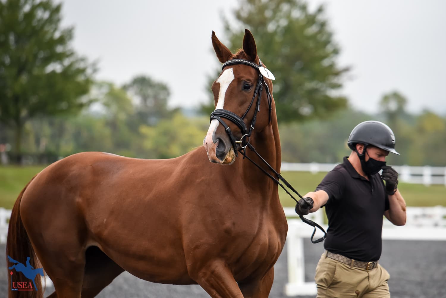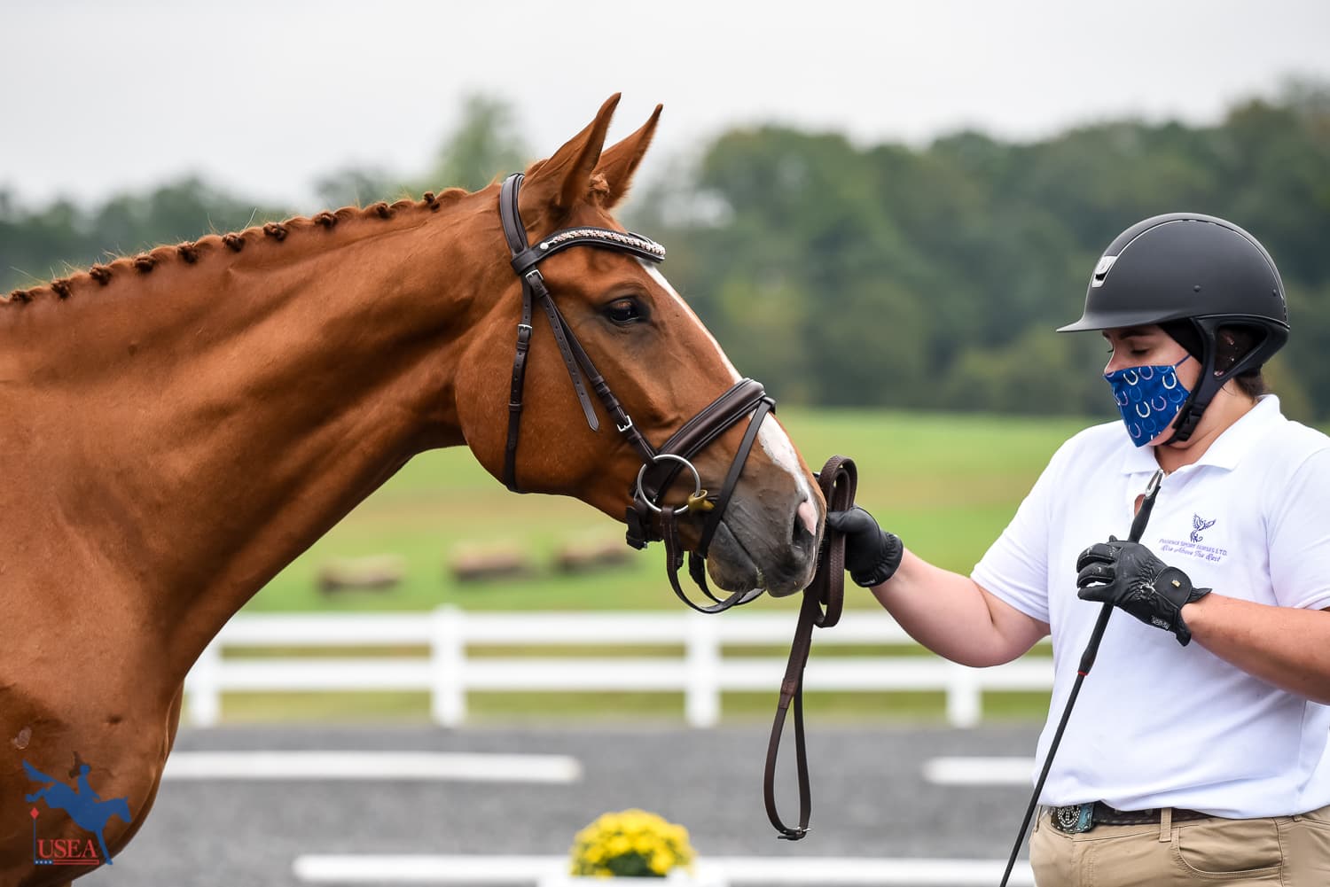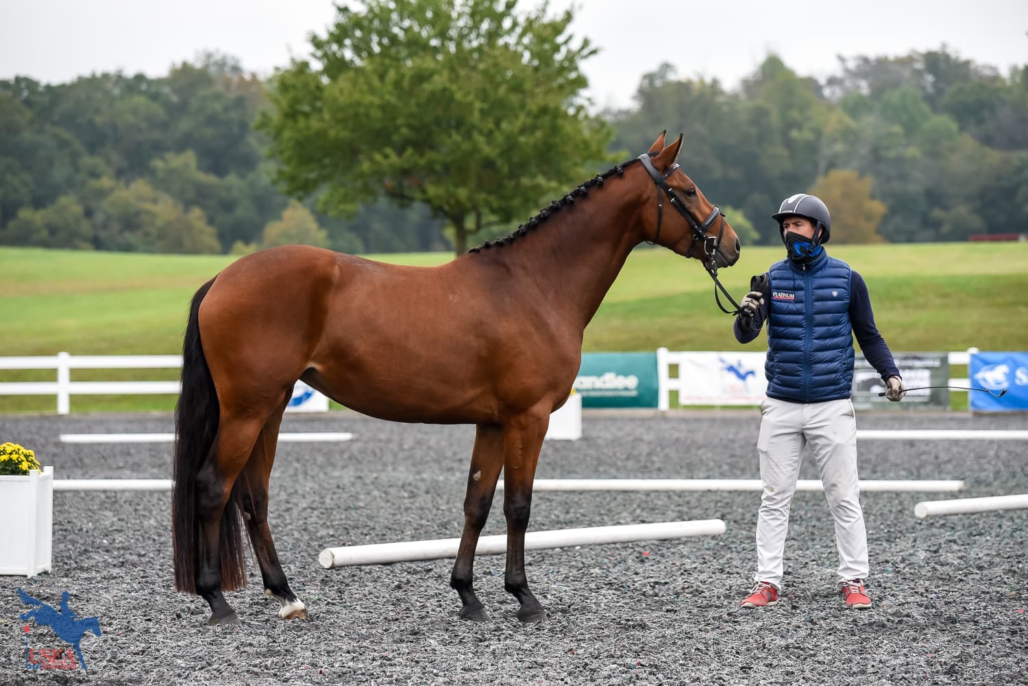 Emeraude Sharer made the trek from her home in North Carolina with her two horses, Ciel d’Emeraude and Knuit d’Emeraude, to compete in their third FEH East Coast Championships. Knuit d’Emeraude (Contendro I x Etoile d’Emeraude), a Holsteiner filly, was the FEH East Coast Yearling Filly Reserve Champion in 2018 and this year took home the FEH East Coast 3-year-old Filly and Overall Champion titles on a score of 81.445 to be named the 2020 USEA FEH East Coast Grand Champion. Knuit d’Emeraude was handled in today’s competition by Martin Douzant.