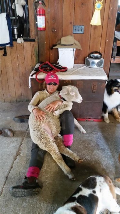 Cloudy has grown up with three dogs: a giant basset named Woody, a Shepherd cross named Ladybug, and a wild Australian Shepherd called Brumby. He grazes freely among fifteen show horses, and they have accepted Cloudy without a problem. Cloudy thinks he is a dog. We call him a sheepdog.