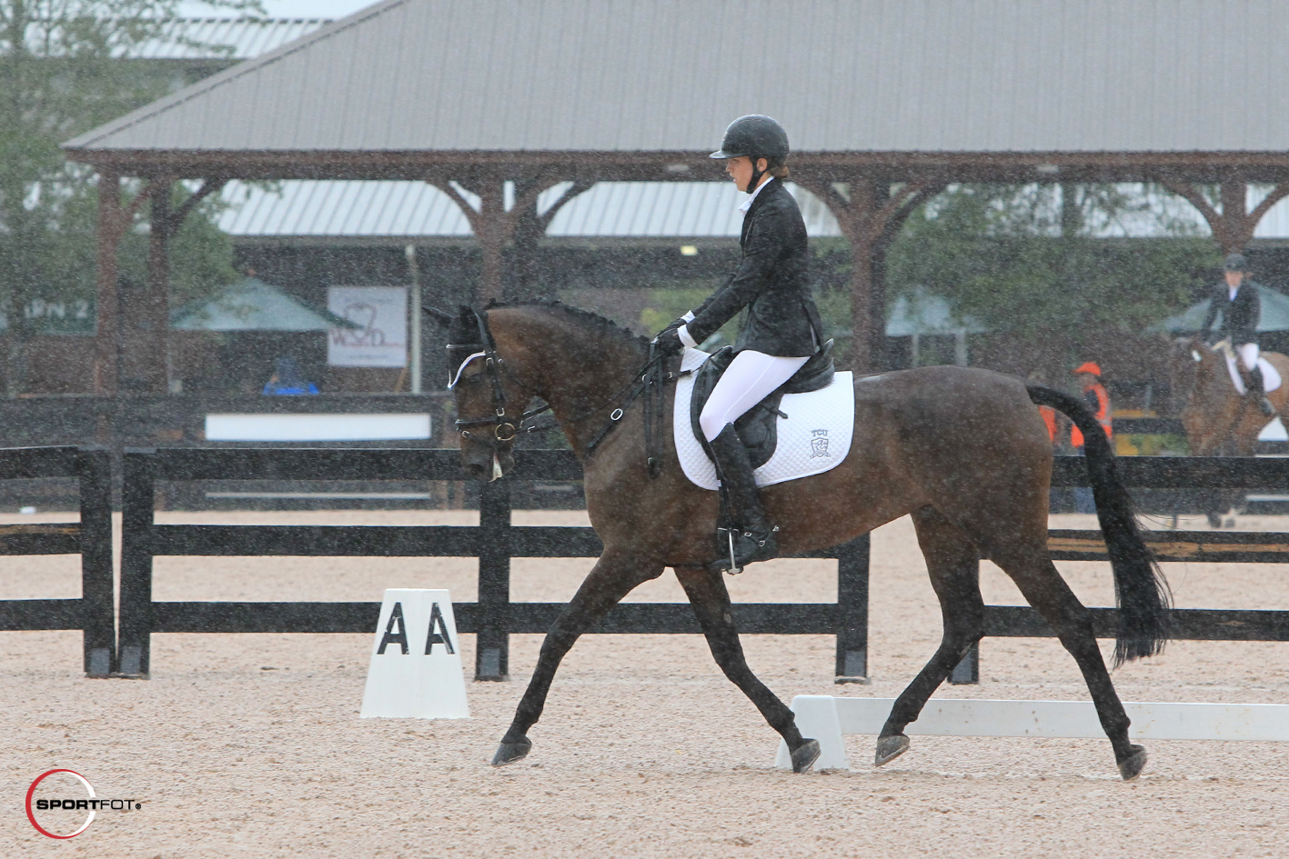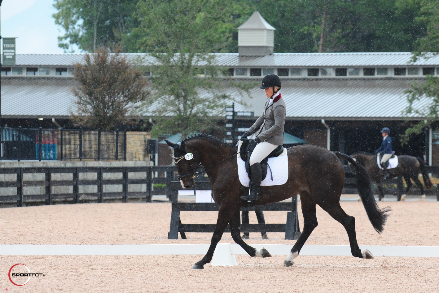 The top three spots in the Junior Novice division after dressage all went to riders who hail from Texas. Sunny Courtwright and her own Around Midnight are leading the field of 59 on a 23.5. Courtwright and the 9-year-old Irish Sport Horse mare got caught in a downpour right as they began their test, but she said it was the best test she feels they’ve had in a while. The pair has only been together for nine months. “Lately she’s been a little stiff, but I had my trainer’s assistant work with me to keep her moving, but it magically clicked,” commented Courtwright, “and then we went in and we had to go past the box a couple times, but it was really nice, and she was really great.”