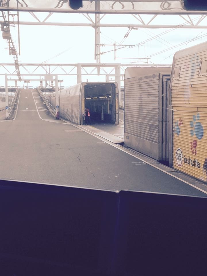Their lorry drove onto this train to take them underneath the English Channel. Photo by Devon Brown.
