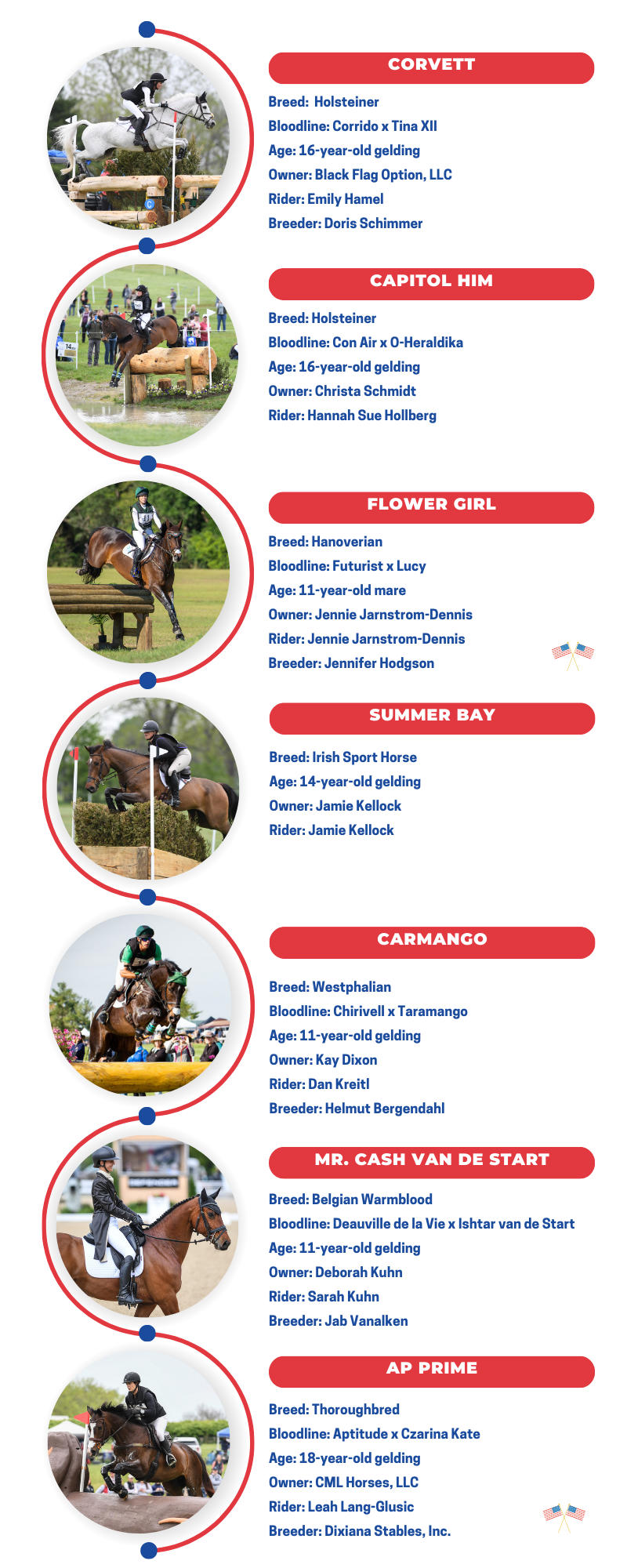 - Miks Master C (Liz Halliday-Sharp), Early Review C (Sydney Solomon), Sorocaima (Buck Davidson), Flower Girl (Jennie Jarnstrom-Dennis), Phelps (Mia Farley), AP Prime (Leah Lang-Gluscic), Camarillo (Doug Payne), and Quantum Leap (Doug Payne) are all U.S.-bred.