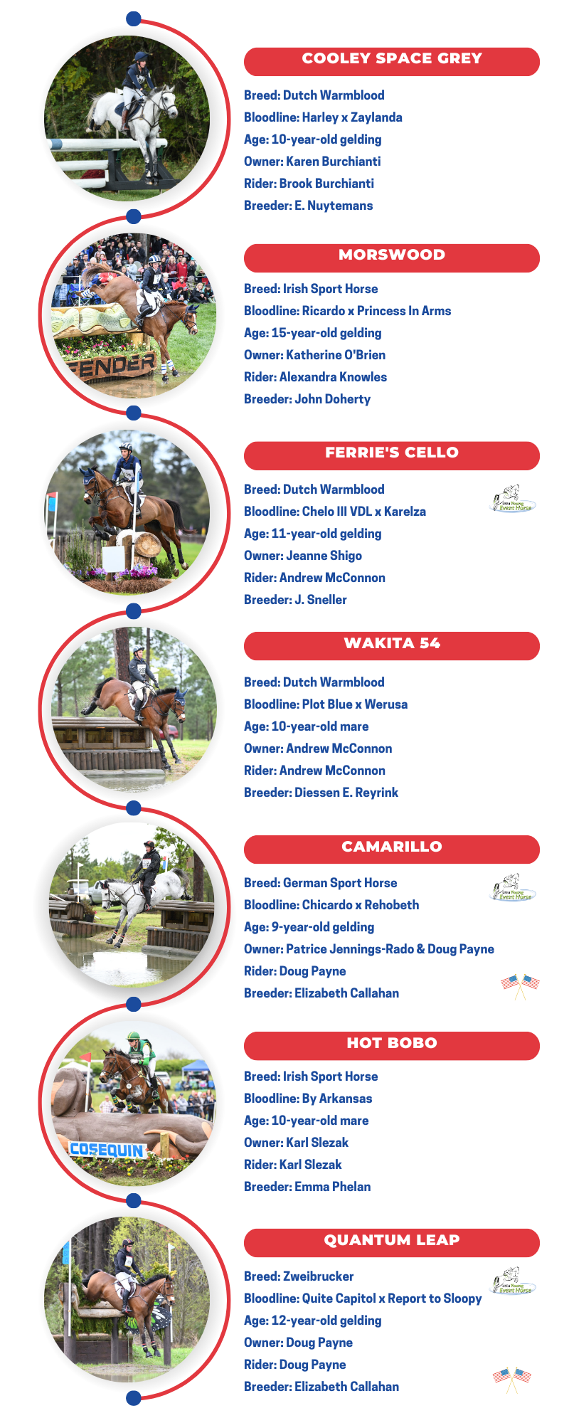 - Andrew McConnon brings Wakita 54, who recently won the CCI4*-S at Rebecca Farm, along with his Strzegom Nations Cup ride Ferrie’s Cello.