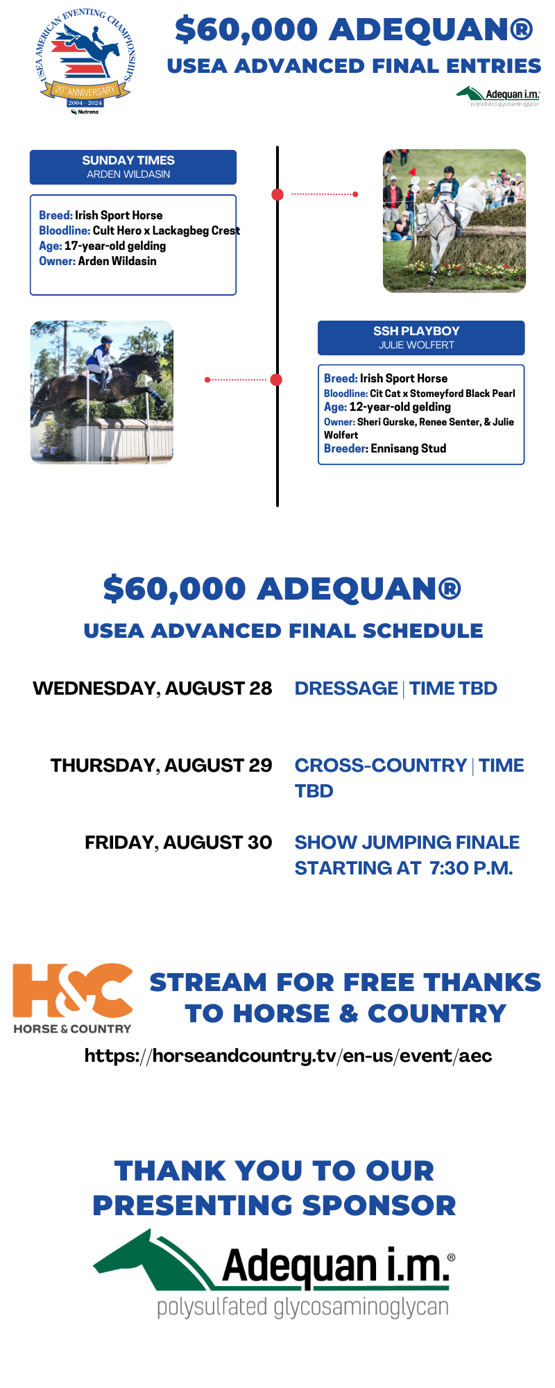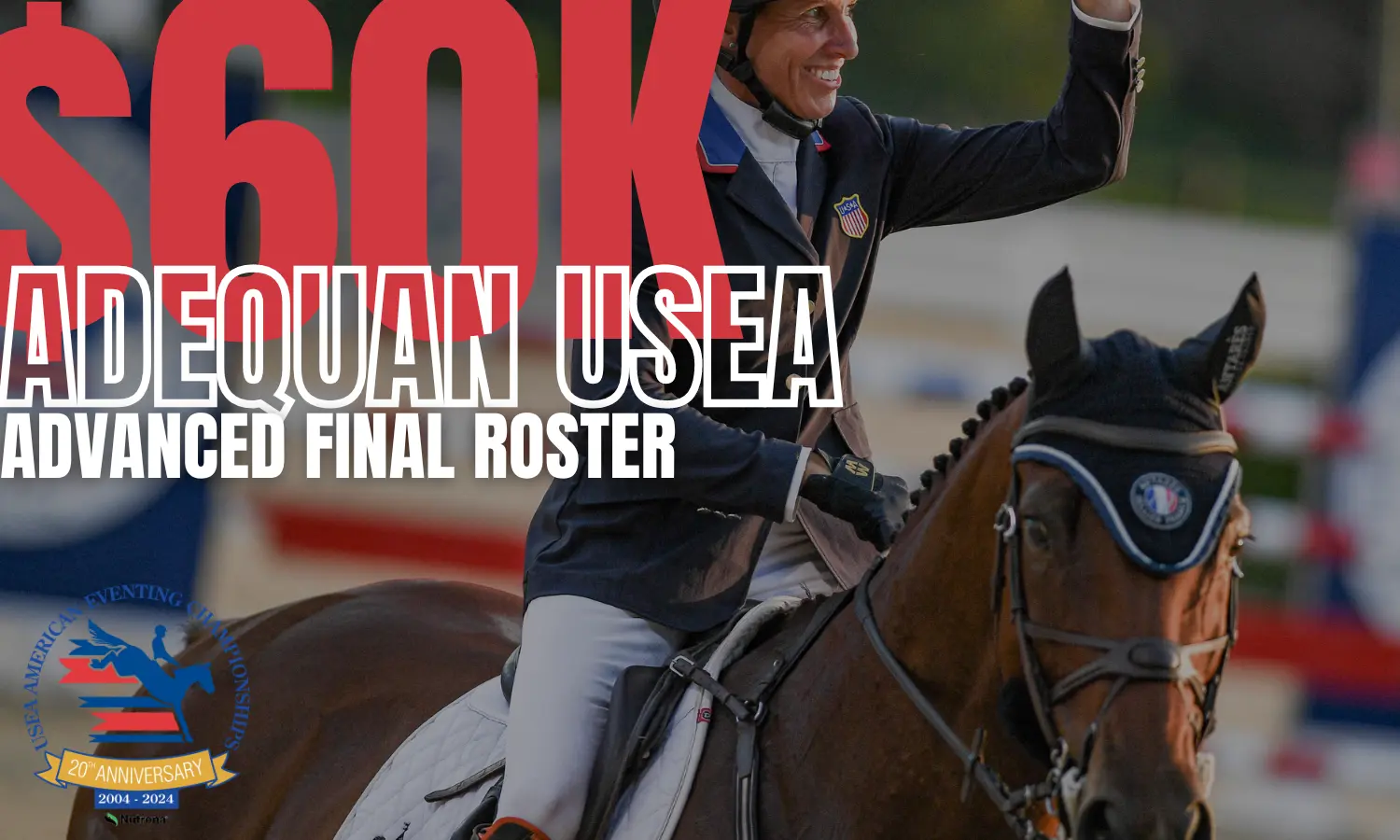 The $60,000 Adequan® USEA Advanced Final will take place at the 2024 USEA American Eventing Championships presented by Nutrena Feeds at the Kentucky Horse Park in Lexington, Kentucky, Aug. 28-30, 2024. Thanks to Adequan’s amazing support, the Adequan® USEA Advanced Final will bring together the country’s top riders to vie for $60,000 in prize money and the title of Adequan® Champion. To qualify for the $60,000 Adequan® USEA Advanced Final at the AEC in 2024, competitors will need to complete a minimum of two events without cross-country jump penalties at any USEA recognized Advanced horse trials, CCI4*-S, CCI4*-L , CCI5*-L, World Championships or Olympic Games. Click here to learn more about the $60,000 Adequan® USEA Advanced Final.