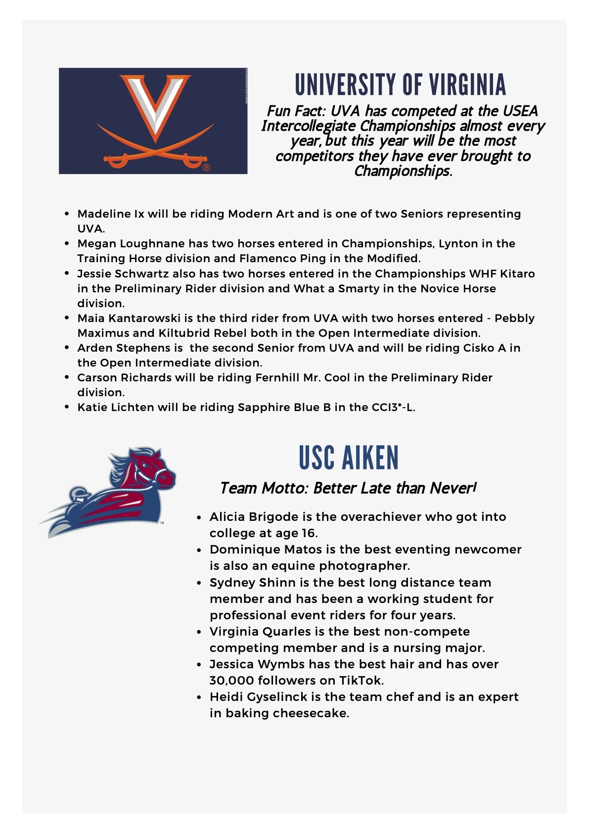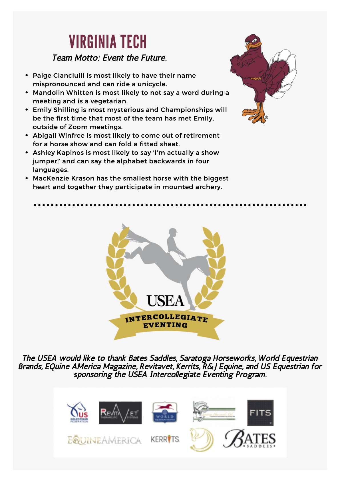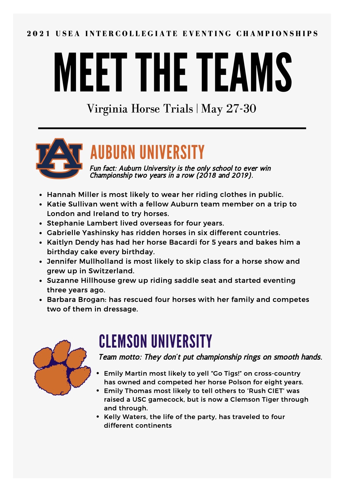 It’s time to meet the teams of the 2021 USEA Intercollegiate Eventing Championships! A total of 105 competitors, 15 schools, and 27 teams will be competing at the 2021 USEA Intercollegiate Eventing Championships on May 27-30 at Virginia Horse Trials.