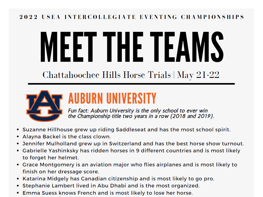 It’s time to meet the teams of the 2022 USEA Intercollegiate Eventing Championships! A total of 92 competitors, 12 schools, and 23 teams will be competing at the 2022 USEA Intercollegiate Eventing Championships on May 21-22 at Chattahoochee Hills H.T. in Fairburn, Georgia.