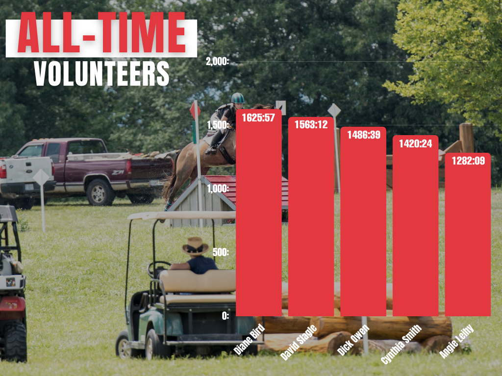 Several familiar names are also at the top of the USEA Medal Program Leaderboard, which tracks all of the hours collected in EventingVolunteers.com since December 1, 2016. Diane Bird, the 2019 Volunteer of the Year, is in first place with 1,625 hours and 57 minutes. The top five on the USEA Medal Program leaderboard are as follows: Diane Bird (1625:57), David Slagle (1563:12), Dick Owen (1486:39), Cynthia Smith (1420:24), and Angie Leihy (1282:09).