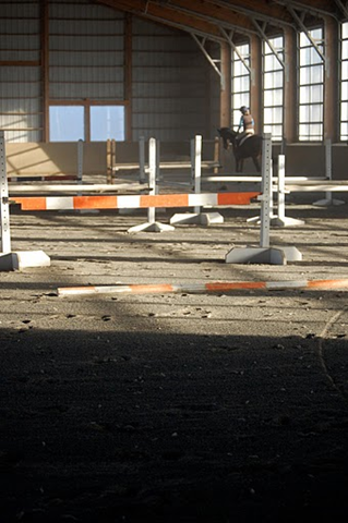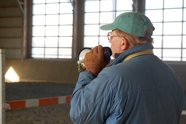 Promptly at 8:57 Jimmy strolled into the indoor with a thermos of coffee in one hand and a miniature bullhorn in the other. I was standing in the entrance to the indoor clutching my camera (as I am the self-appointed barn photographer), and Jimmy immediately accosted me to be jump crew. Of course I was happy to help Jimmy set fences!