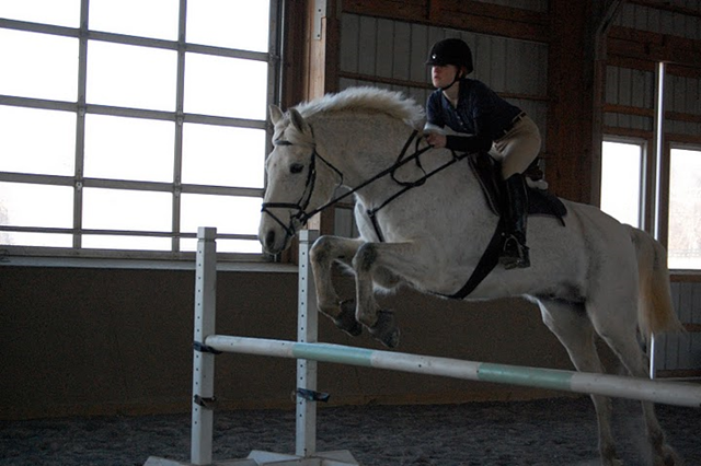 The lesson started with simple walking over a pole and plank on the ground. Jimmy said that he wanted our reins to be so long that any other trainer who walked in would think that we were sloppy. We then progressed to trotting a small vertical. Jimmy immediately got after me to put my heels down. I was mortified – it had been years since someone had told me to put my heels down. Apparently I needed it though and it was kind of refreshing that Jimmy would notice that little detail.
