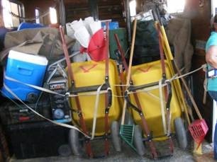 We went to bed very late Friday night, which was a bad plan as we got up at 5 am to head to the track by 6 to do the final team gallop. All the horses galloped and cooled down well. We had eight horses go to the track and just one water hydrant without a hose, so I had the grooms practice vet box techniques with multiple buckets, sponges, and scrapers. After cooling the horses down, we took them back to Gold Chip and spent the rest of the morning icing the horses and packing the rest of the tack and feed.