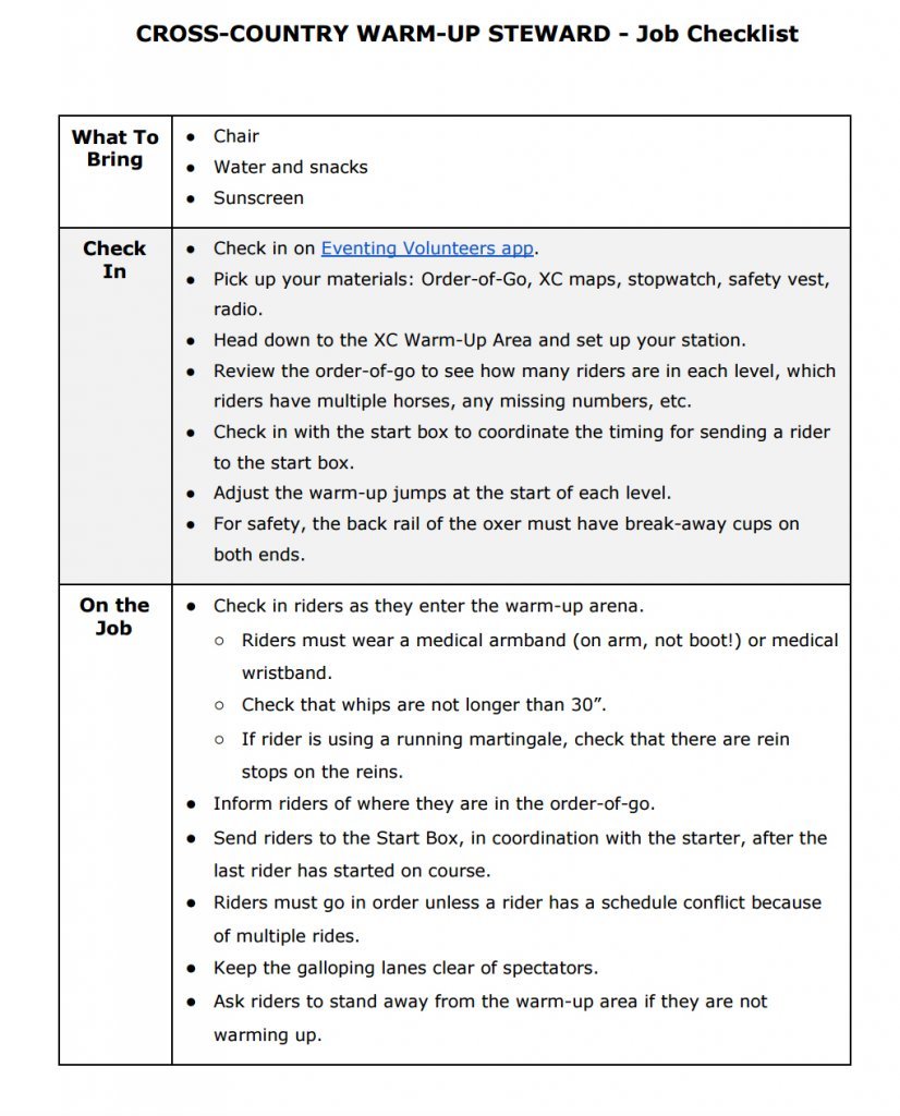The job checklists include comprehensive information about each volunteer position, including scribe, warm-up steward, bit checker, jump crew, and many more. These checklists include details about what to bring on the day, how to check-in upon arrival, tasks that will be performed on the job, and checking out at the end of the day.