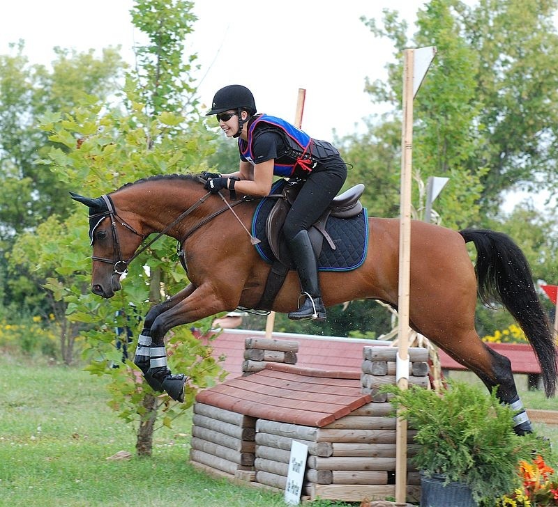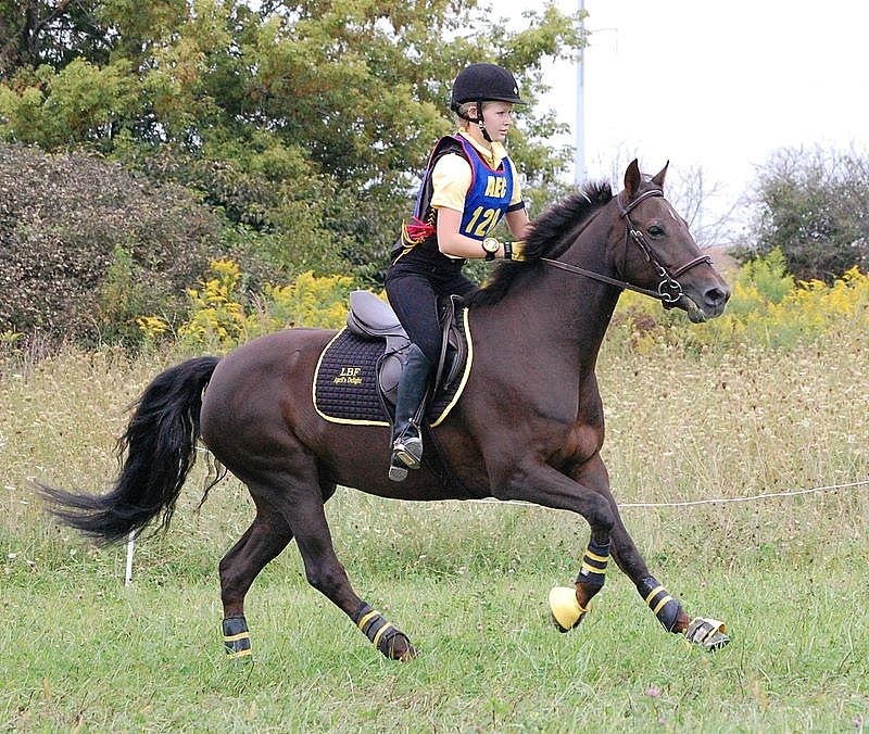 (Photo Above Right & Left: Axel takes to the cross-country course at the AEC with gusto, while Megan smiles and enjoys the ride. Emily Daily photo.)