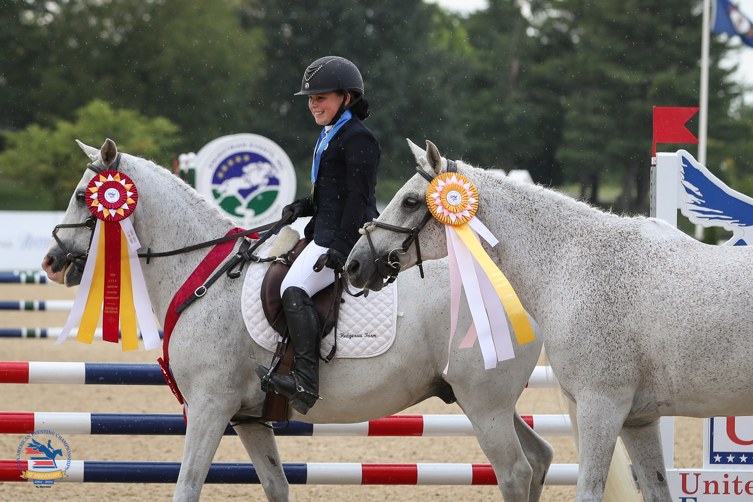 If you thought you were seeing double today when you saw Kendal Fansler trot into the Rolex Arena twice aboard an adorable gray pony, you weren’t mistaken. The young rider from Clarksville, Maryland, had two identical mounts in this division: Hedgerow Farm’s 14-year-old Connemara gelding Delilah’s Boy and Hedgerow Farm’s 20-year-old Anadalusian gelding Curioso (Nishkito x Bright Easy Jet), who she was placed third and fifth with, respectively, after cross-country.