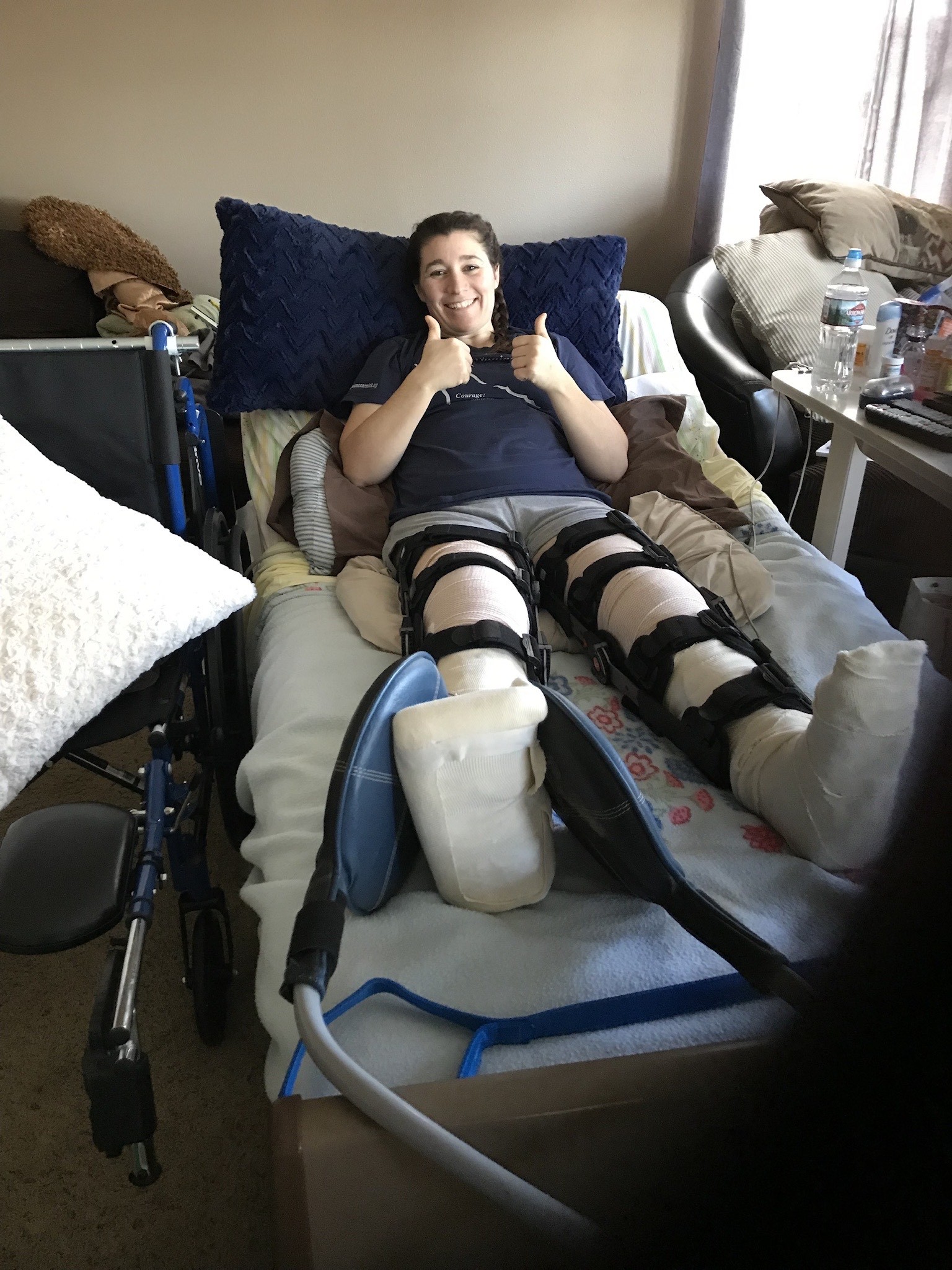 In 2019, a snowboarding accident put me in a wheelchair. I sustained injuries consisting of two blown ACLs, two fractured tibial plateaus, two dislocated feet with multiple bone fractures within the feet, and damage to many of the joints within the foot. I had several pins and plates put into my feet, my ACLs were sewn back together, and my tibias were reattached to the plateaus. I was in casts nearly the entire length of my legs and I could hardly move.