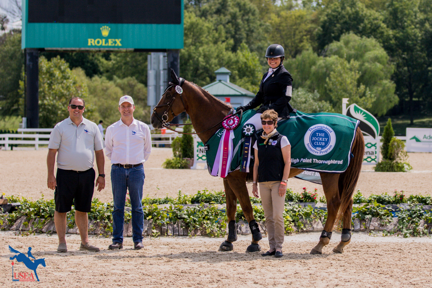I got another surprise when they announced Cody received The Jockey Club Thoroughbred Incentive Program High Point for our division. They put a TIP cooler sheet on him. When we did the victory gallop I noticed how slippery that makes the saddle! Cody thought he was going to race, and I thought I might be quite embarrassed if he decided to perform some airs above the ground!