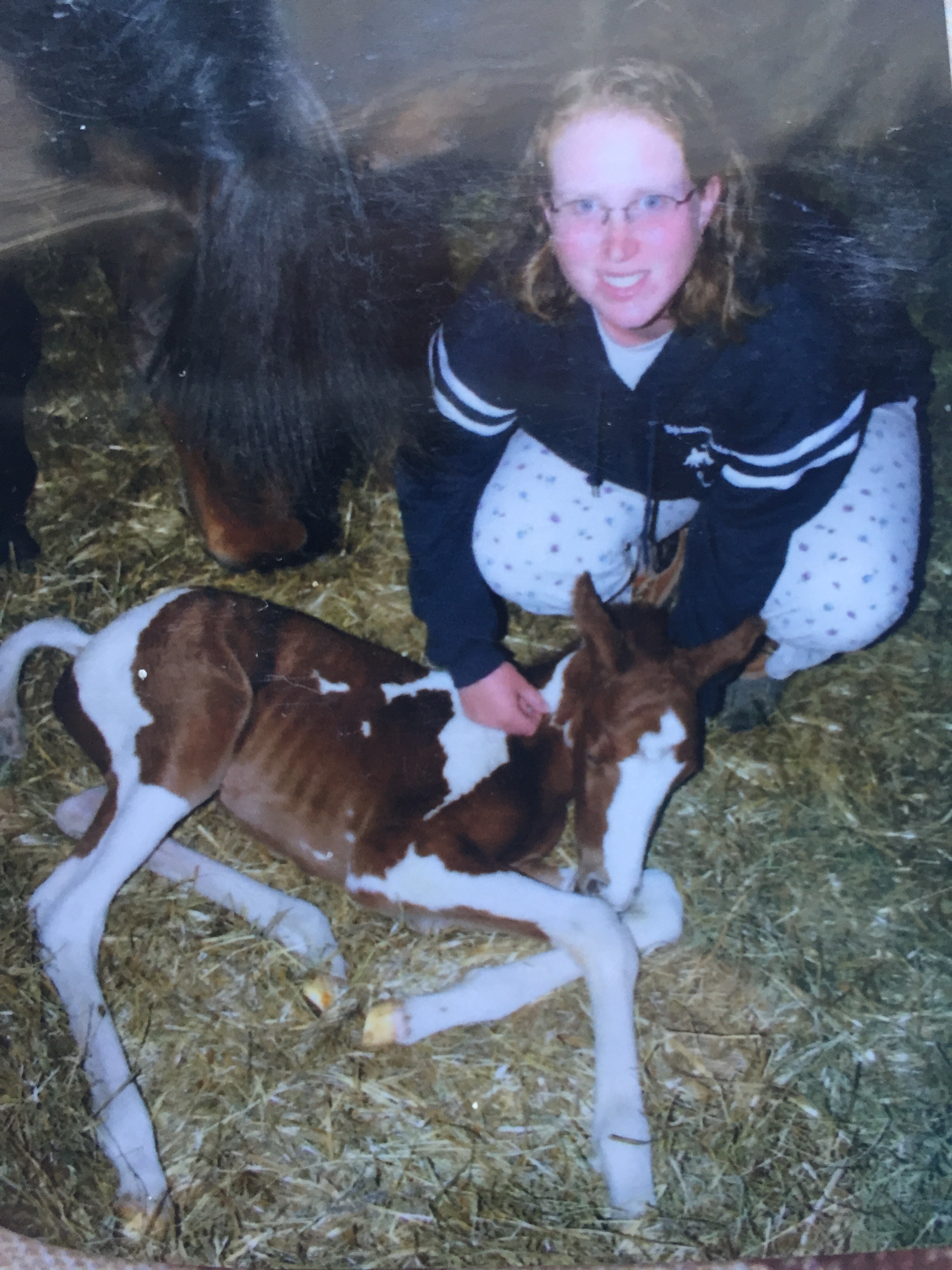 May 12, 2009 at 2:17 a.m., I peeked over the stall with great anticipation as my long-awaited foal was finally making her debut into my life. Foxy, who was the dam, was a very talented lesson horse with no extraordinary bloodlines but 3/4 Connemara and 1/4 Thoroughbred and she had a love for jumping. Before she was too old, I decided to breed her with a nice Thoroughbred/Oldenburg stud (Counterclaim from Flying Colors Farm in Florida) that happened to be homozygous with the pinto color gene. I love horses with color and was ecstatic to see what the foal would look like.