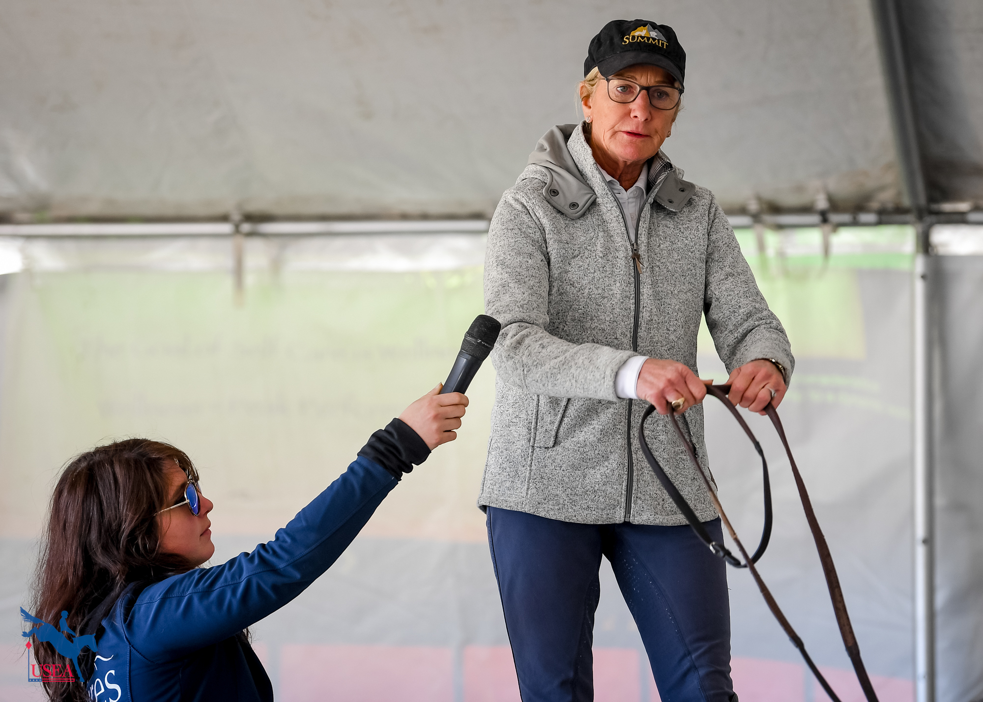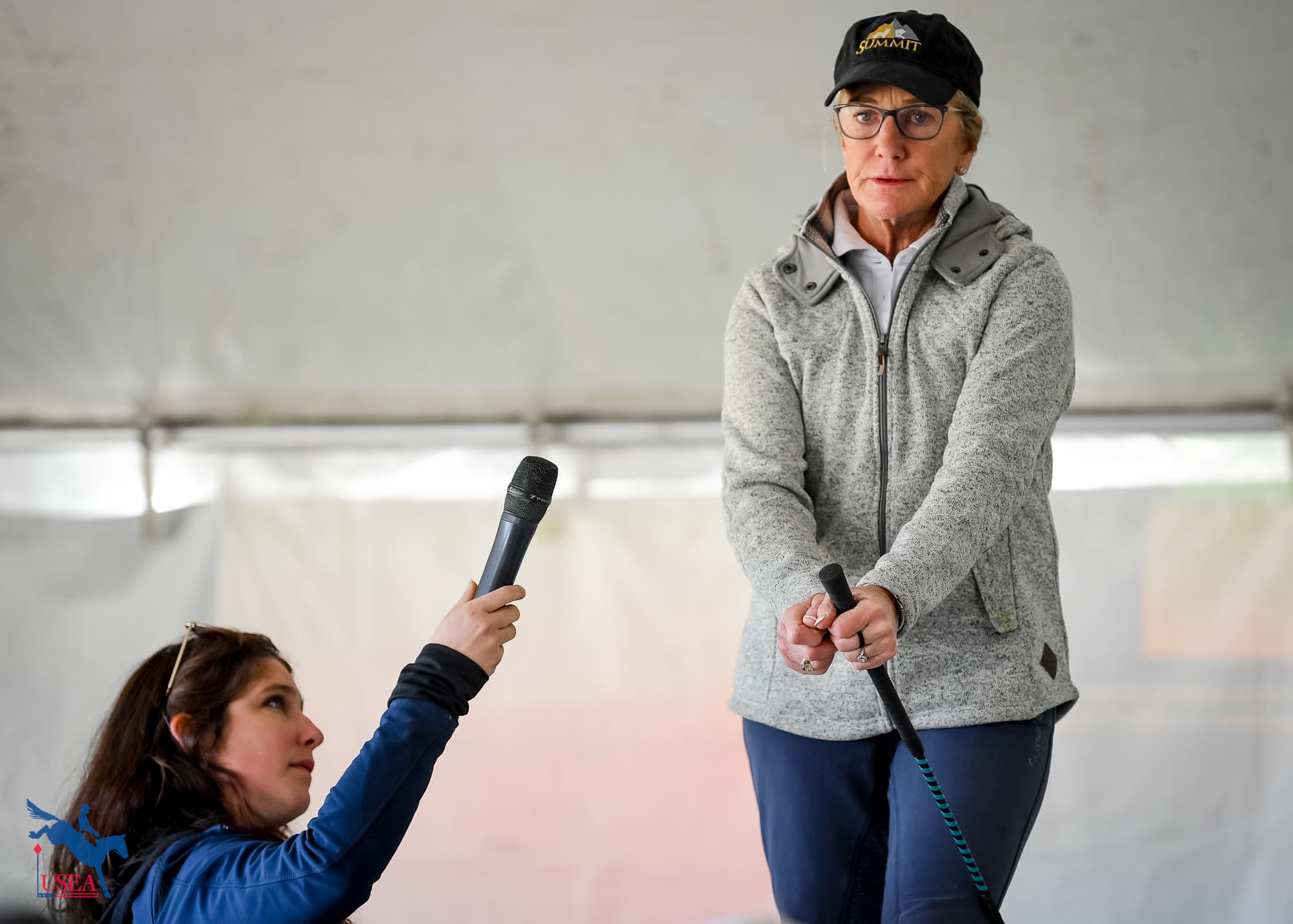 Ocala, Fla.—Jan. 31—Olympian and five-star winner Karen O’Connor took the literal reins at the start of day 2 of the USEA Eventing Coaches Program (ECP) Symposium as she spoke about proper cross-country position in front of a group of enthusiastic riders and coaches at the Florida Horse Park.