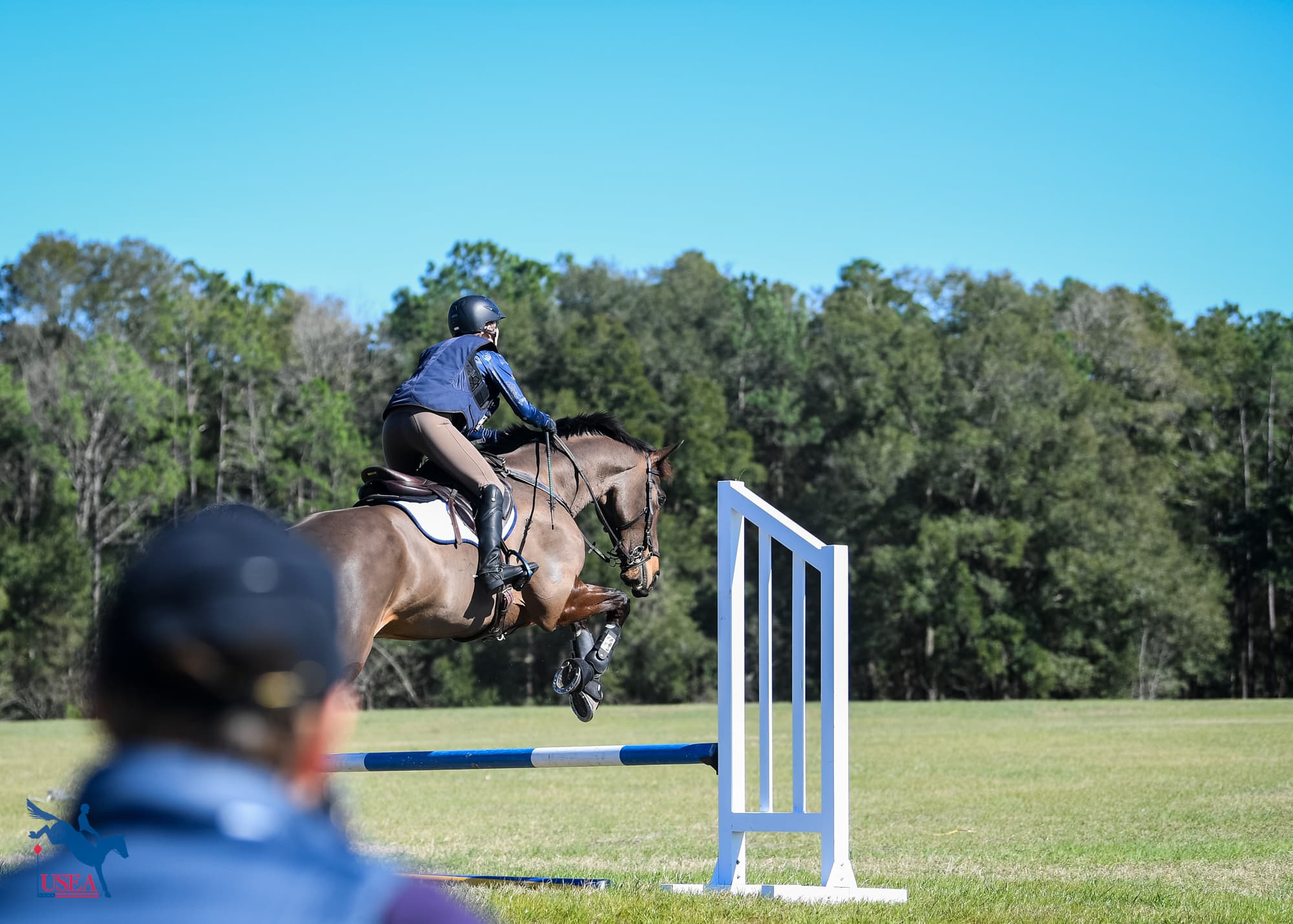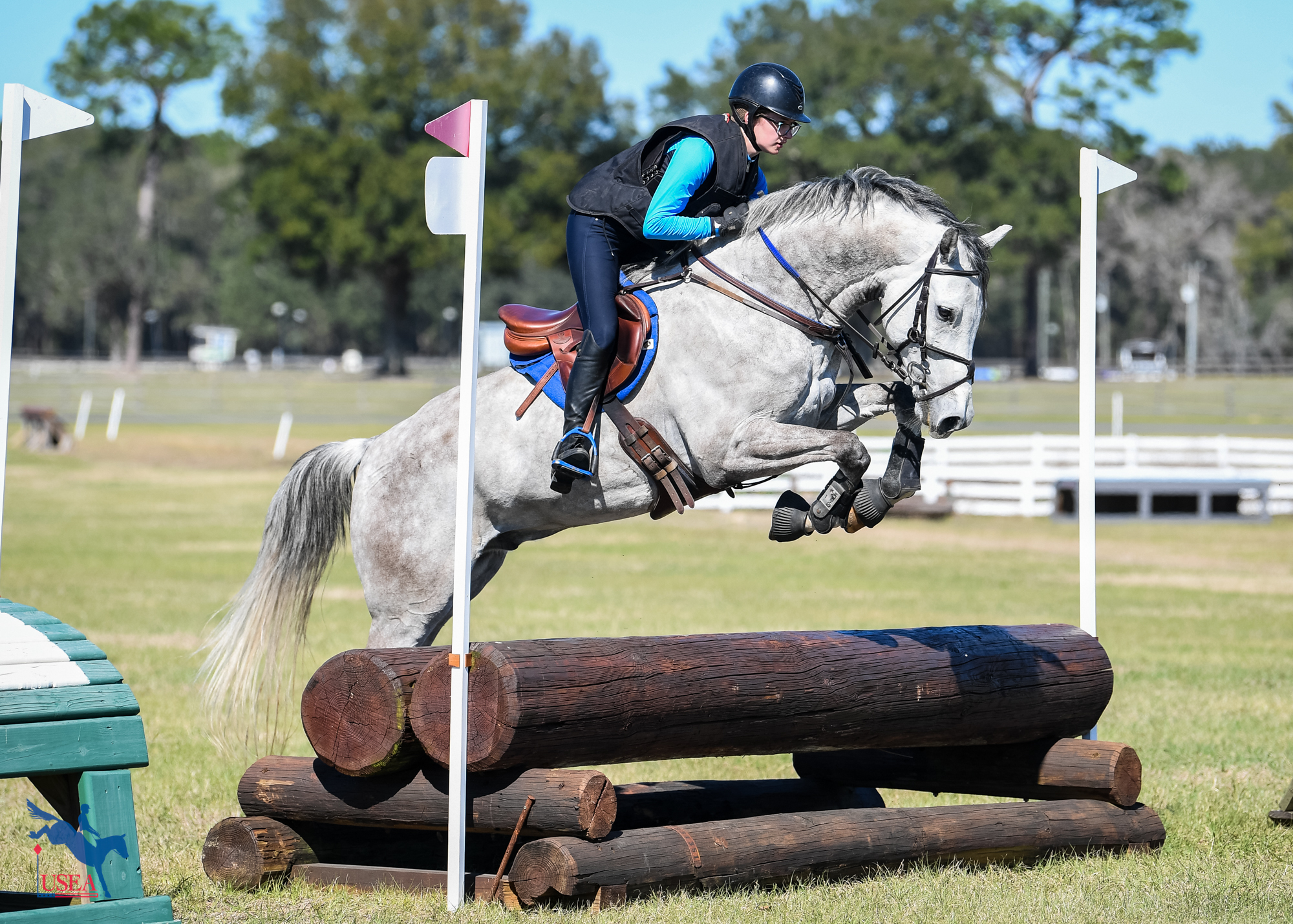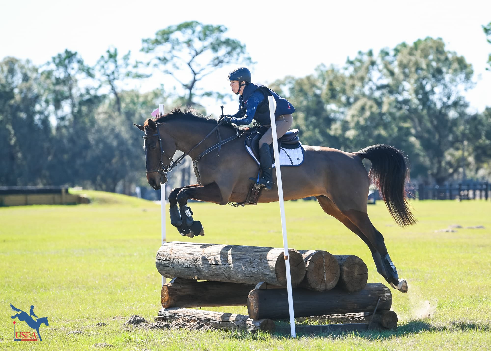 O’Connor coached her and had her “walk, trot, pop” over a small log. She encouraged her to “row the boat” with her arms when riding any green horse towards a fence they might be unsure about and to give the mare plenty of time in a straight approach to see each jump since green horses think slower.