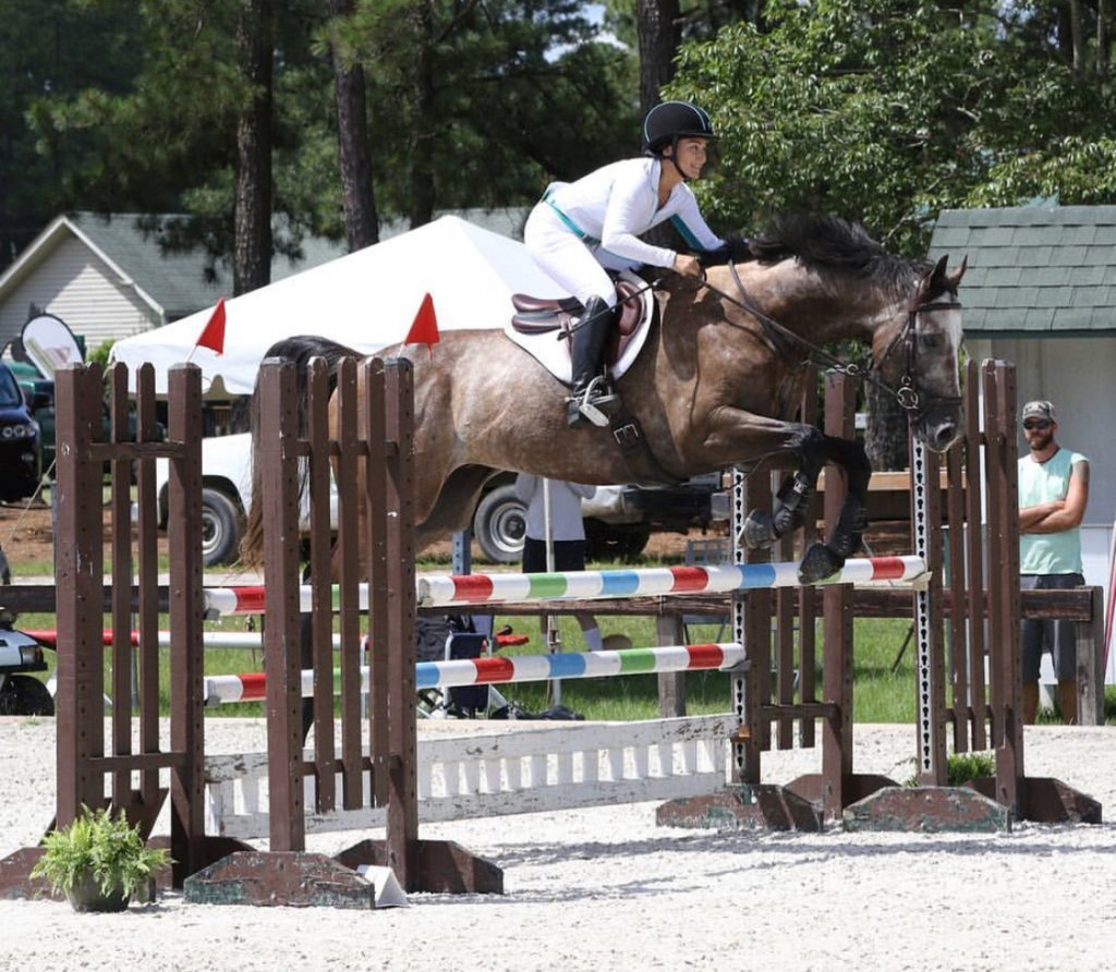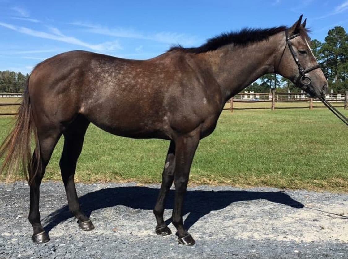 For this month’s OTTB critique we will look at one such OTTB who luckily for his owner, Lisa Chan, was retired and found his way to Southern Pines, North Carolina. Little Lies or Shimba as he was known on the track, is a 7-year-old striking grey gelding who is currently blossoming in his next career. To help further analyze his pedigree and evaluate his confirmation, we have brought in Asia Vedder.