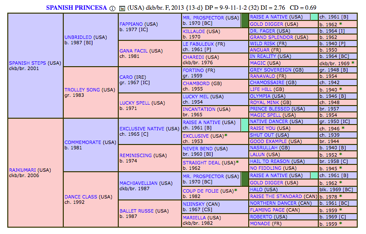 Through her work with TROTT, Excell Brady met Christine Boyd, who is a wealth of knowledge on Thoroughbred bloodlines. She took a look at Spanish Princesa’s pedigree and was impressed. “There are a lot of sires in here who are known for siring good jumpers: Hail to Reason, Caro, and Nijinski II. Machiavellian is Zenyatta’s grandsire through Street Cry, and Street Cry is really turning out to be a versatile sire.” Boyd also expressed admiration for Spanish Princesa’s sire, Spanish Steps. “He’s a full brother to Unbridled Song, and Unbridled Song is quite a sire. The pedigree on the whole is great, it looks like she’s quite nice, though I do see some potential for a fiery temperament.”