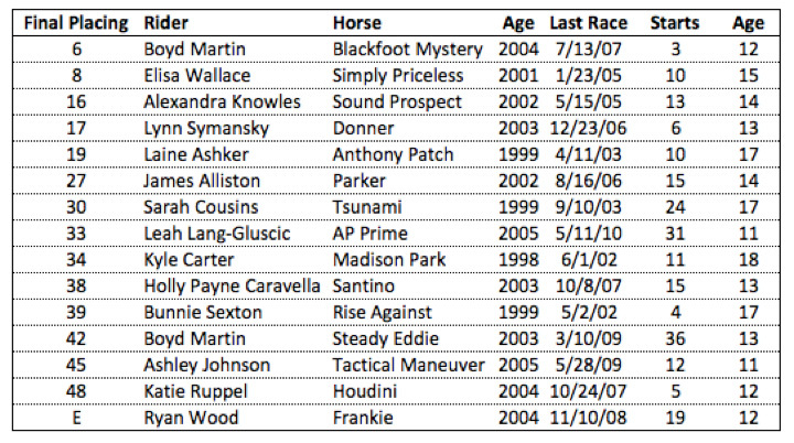 And one final stat to smash a stereotype is average number of races run. Some people believe that they should be looking for ex-racehorses with very few starts, thinking erroneously that the longer they race the less sound and trainable they will be. Our Rolex OTTBs had an average of 14 starts. They were real racehorses with significant careers on the track before beginning their training as event horses. Leading the group was Steady Eddie with 36 starts. Frankie had the most winnings at $99,310.
