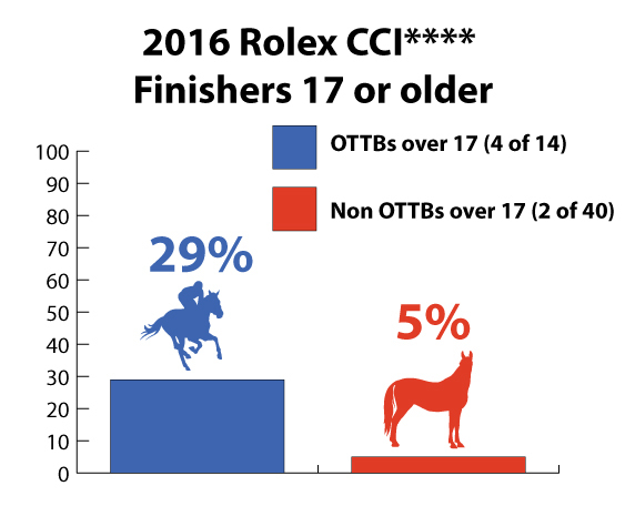 Six of the 54 horses who completed Rolex this year were age 17 or older. All but two of them were Thoroughbreds that raced. Yes, you read that correctly. Put another way, two-thirds of the oldest horses finishing the event were OTTB's despite that fact that they were only 26% of the finishers. So 29% of our OTTB's were age 17 or older while only 5% of non-OTTB's were that old.