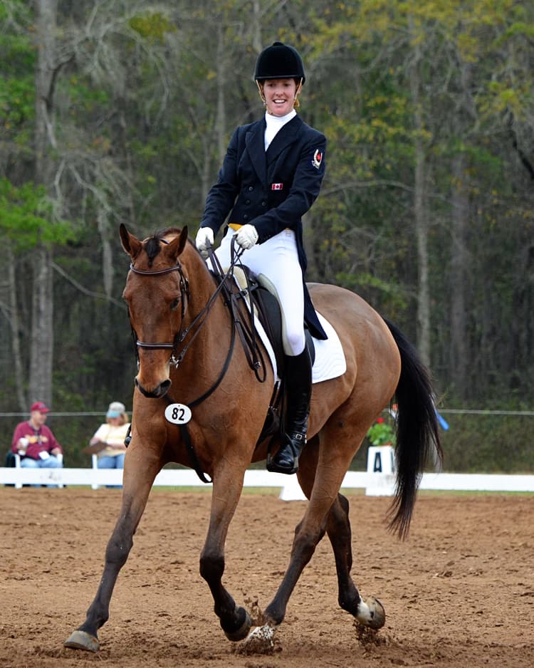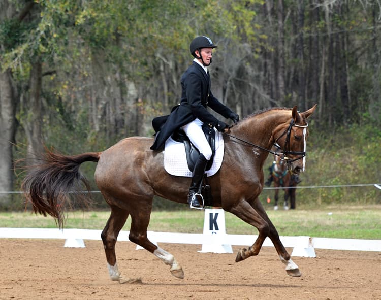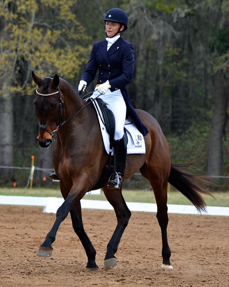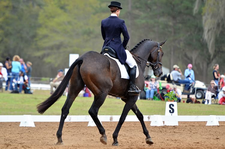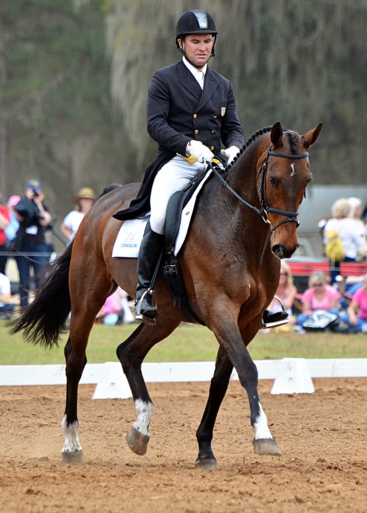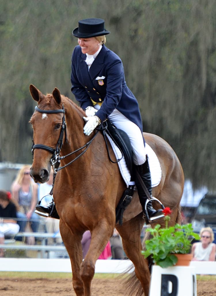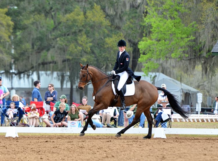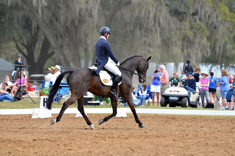 Karen O’Connor also sits back-to-back on the leaderboard with her pair of mounts, Veronica and Mr. Medicott. Interestingly, Karen got the chance to redo a movement with Mr. Medicott when a commotion in the adjacent ring caused Mr. Medicott to leap forward during the half-pass. The judge stopped Karen briefly and requested her to begin the half-pass again.