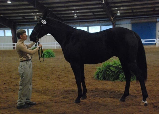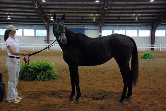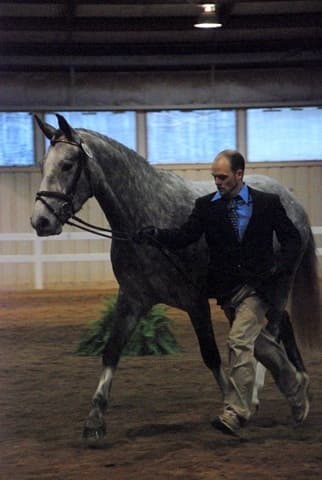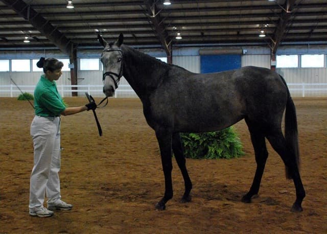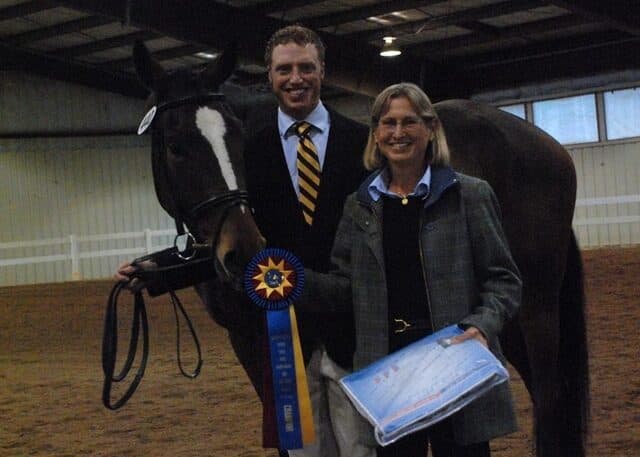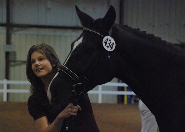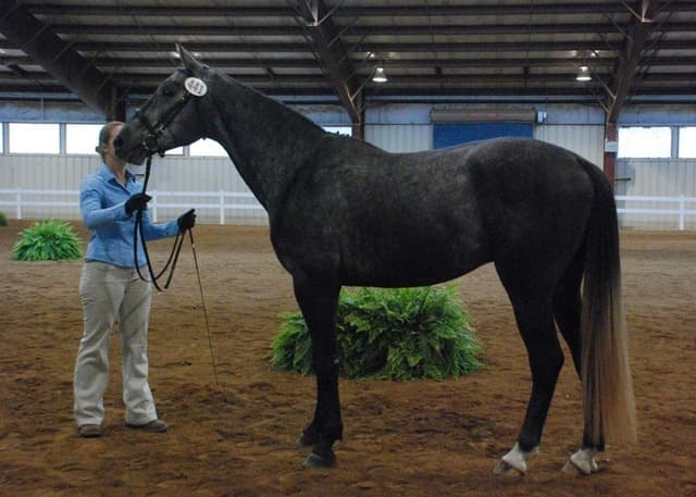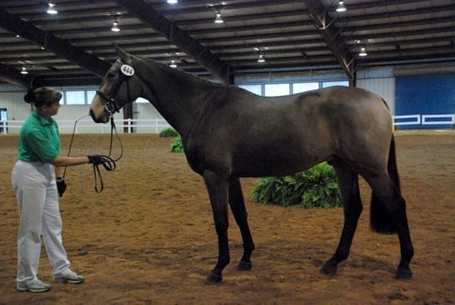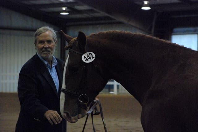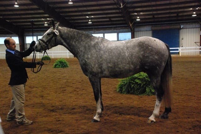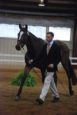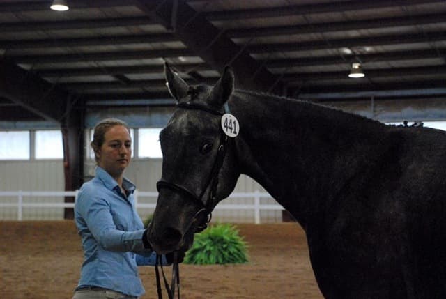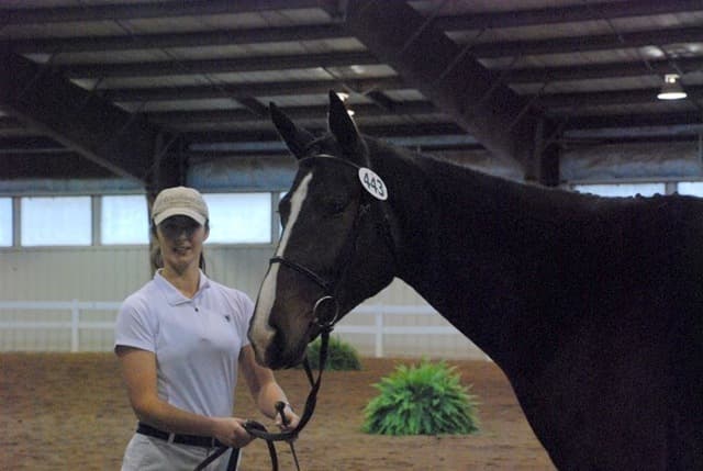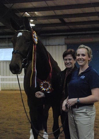 The three-year-old Oldenburgs dominated the competition, with Royal Tribute taking the win in the Three-Year-Old Colt/Gelding Championships, the Three-Year-Old Overall Championships, and the Overall Grand Championship. The leggy Oldenburg gelding (Royal Prince—Firstar) is owned by Kristen Burgers and scored a commendable 77.35. Though Lauren Seitz’s Oldenburg filly Just About Perfect scored higher in her Three-Year-Old division (taking the win with a 78.65), she had to settle for Reserve Three-Year-Old Overall Champion and Reserve Overall Grand Champion of the show. Emily Daily photos. (Left: Royal Tribute & handler Doug Payne accept their ribbons from judge Susan Graham White.)